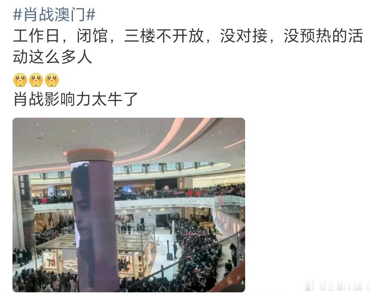肖战澳门活动现场人气肖战澳门 ~工作日闭馆+三楼不开放,活动没对接、零预热,~还是在澳门.结果现场挤得满满当当!人声鼎沸!~谁看了不说一句肖战的影响力,还上世趋了~肖战真·自带流量buff,长红7年了!依旧是唯一站在山顶上的👍🏻!要在内地线下,肖战都挤不进去.