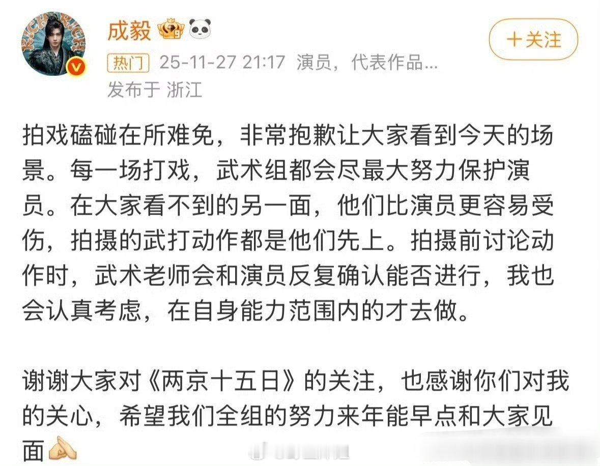 成毅发微博回应了自己在拍摄两京十五日期间吊威亚受伤一事了,说拍戏磕碰在所难免,非常抱歉让大家看到今天的场景。每一场打戏,武术组都会尽最大努力保护演员……