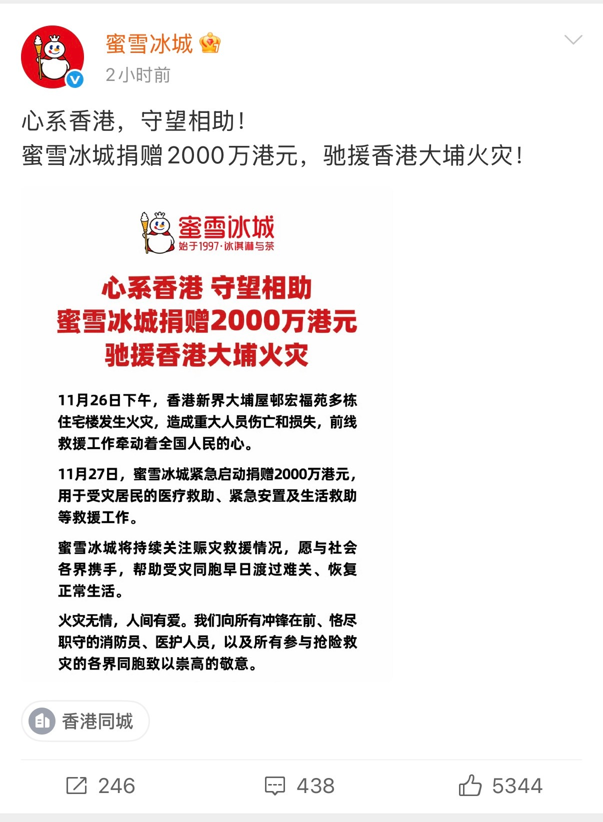 蜜雪冰城捐赠2000万港元驰援香港大埔火灾,小雪,仁义这一块没的说,卖的便宜还捐的多,我以后多喝雪王。