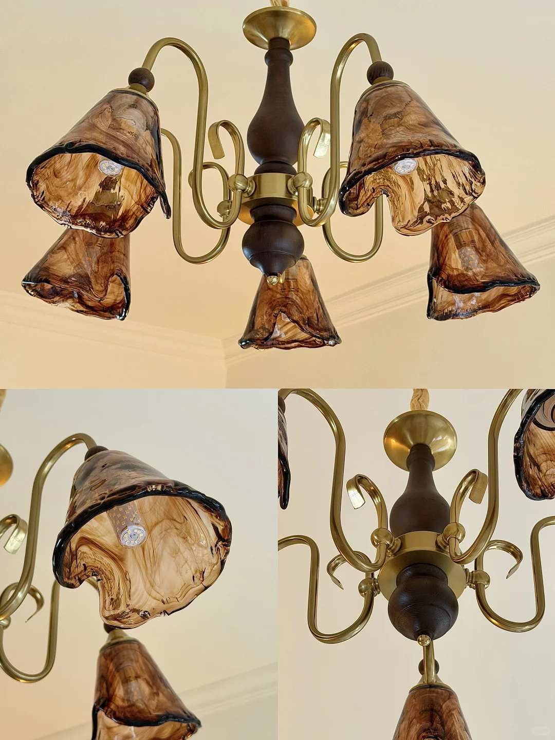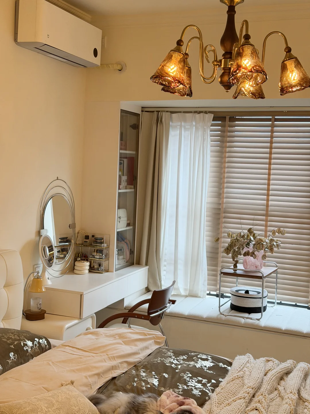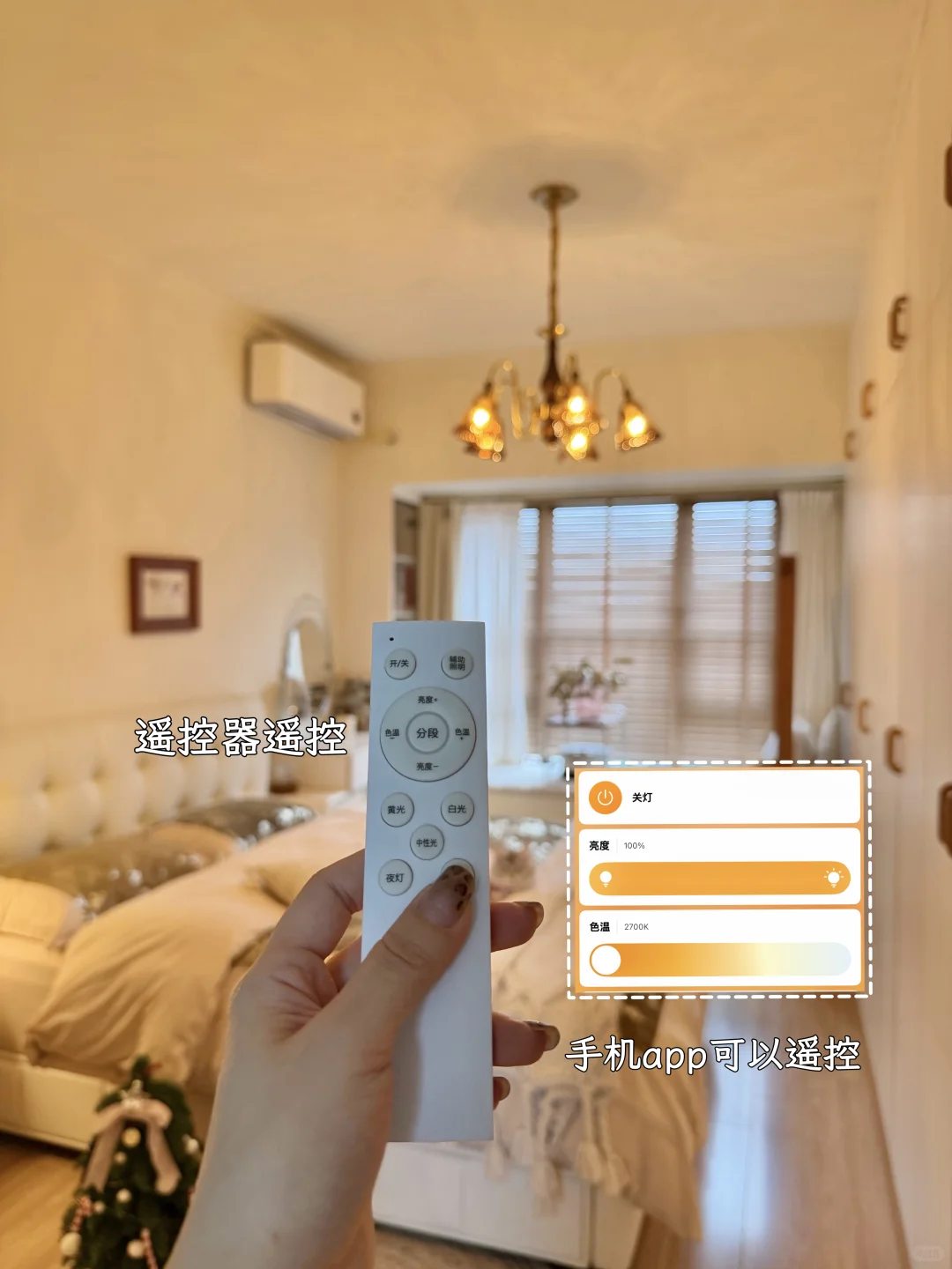 亮度本来是我最担心的,总怕吊灯美丽废物好看但不亮。这盏珀光5头50W 的亮度能照亮整个卧室。刷剧开暖光,光线柔柔的不刺眼,看久了眼睛也没刺痛的感觉;早上化妆时我会换成白光模式,清爽明亮,连细节都看得清楚。