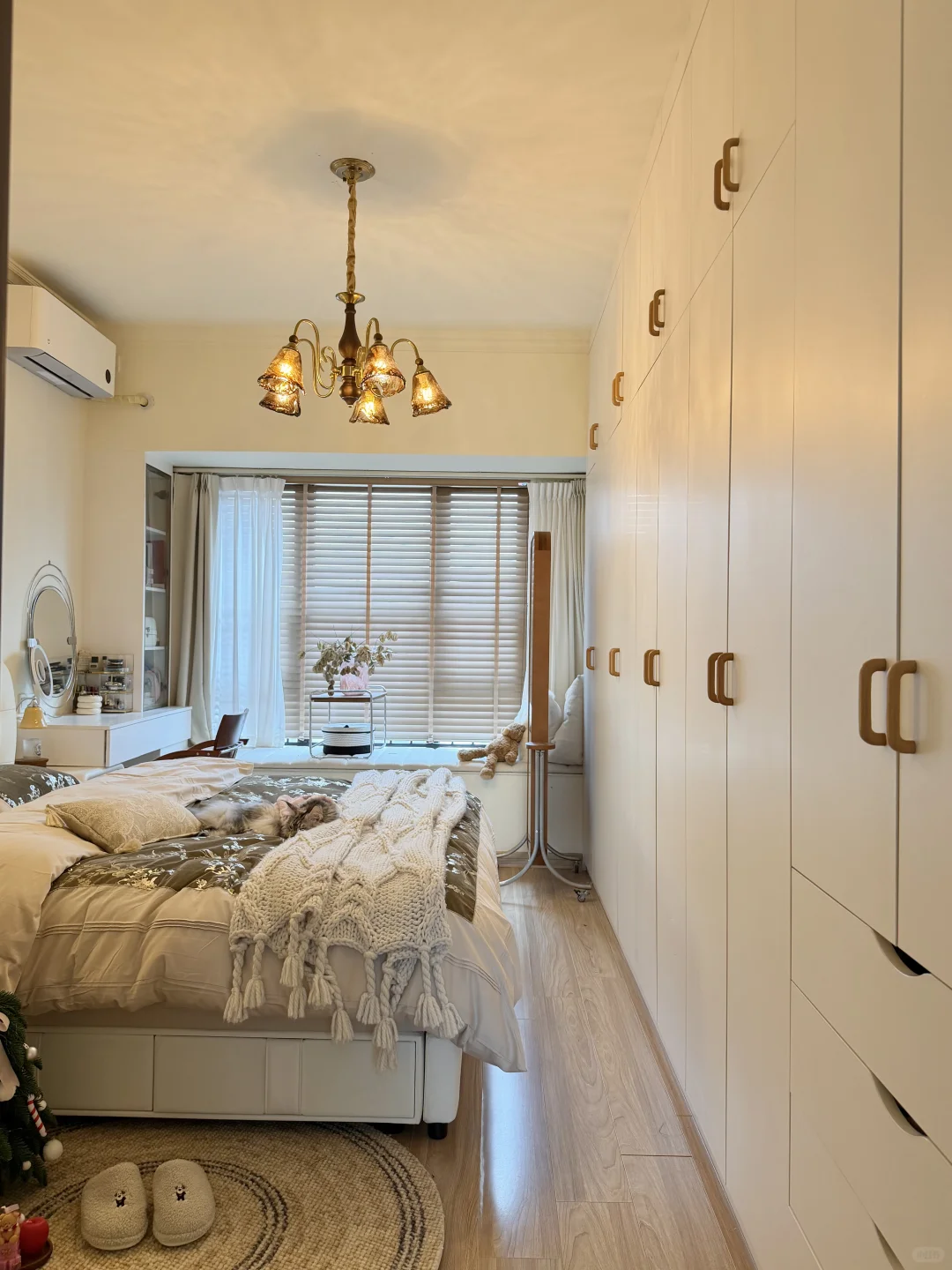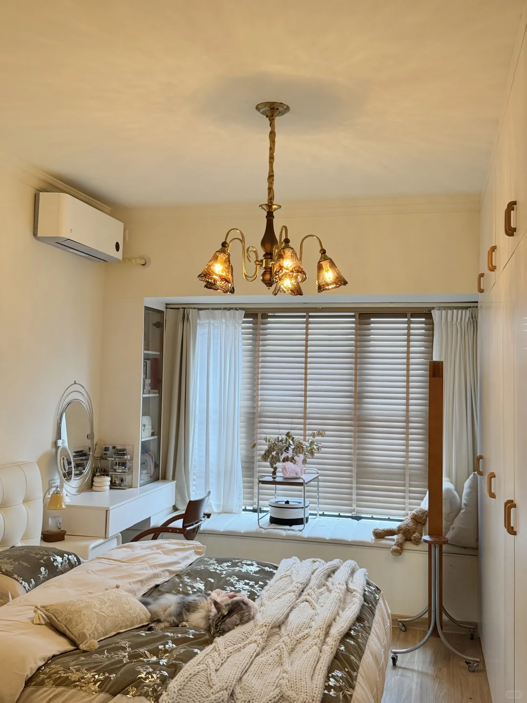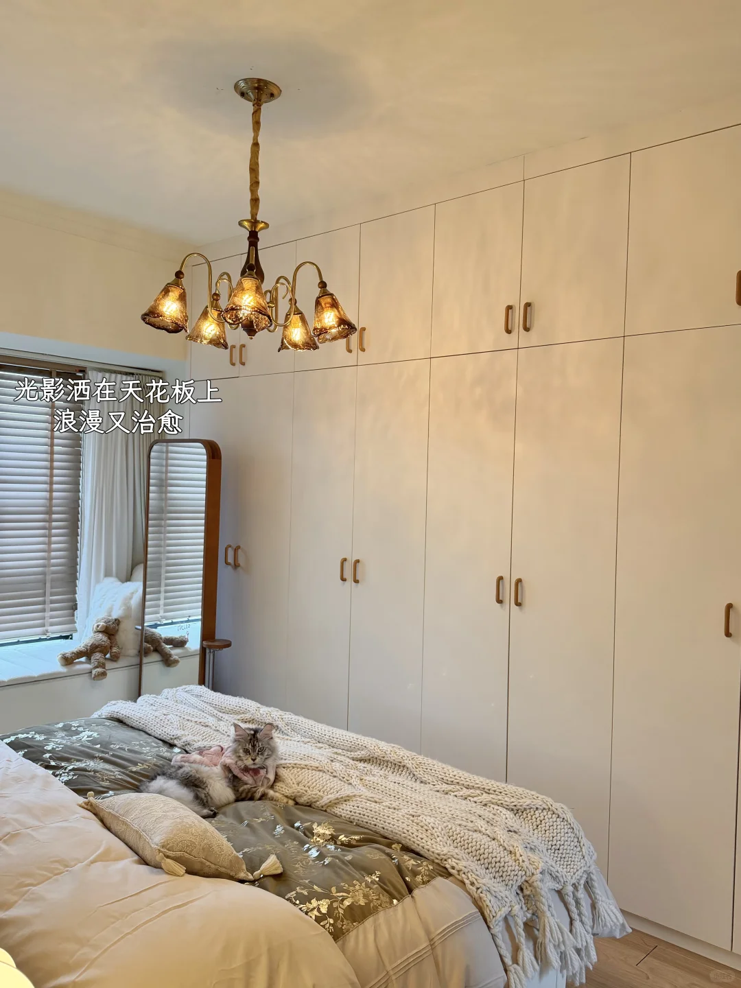 再用一盏漂亮的复古风吊灯点亮氛围感,让整个空间干净、温柔,又舒适。