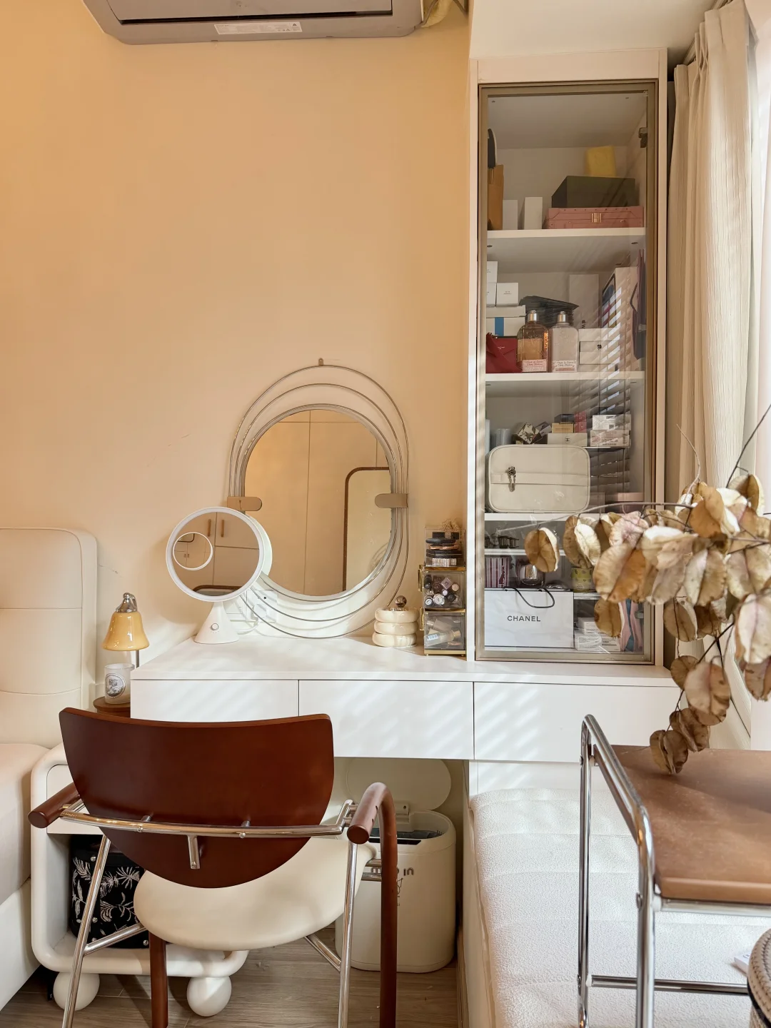 柜子以白色为主,再用一点木色把手点缀。放进奶白色皮床、胡桃木镜子和椅子,