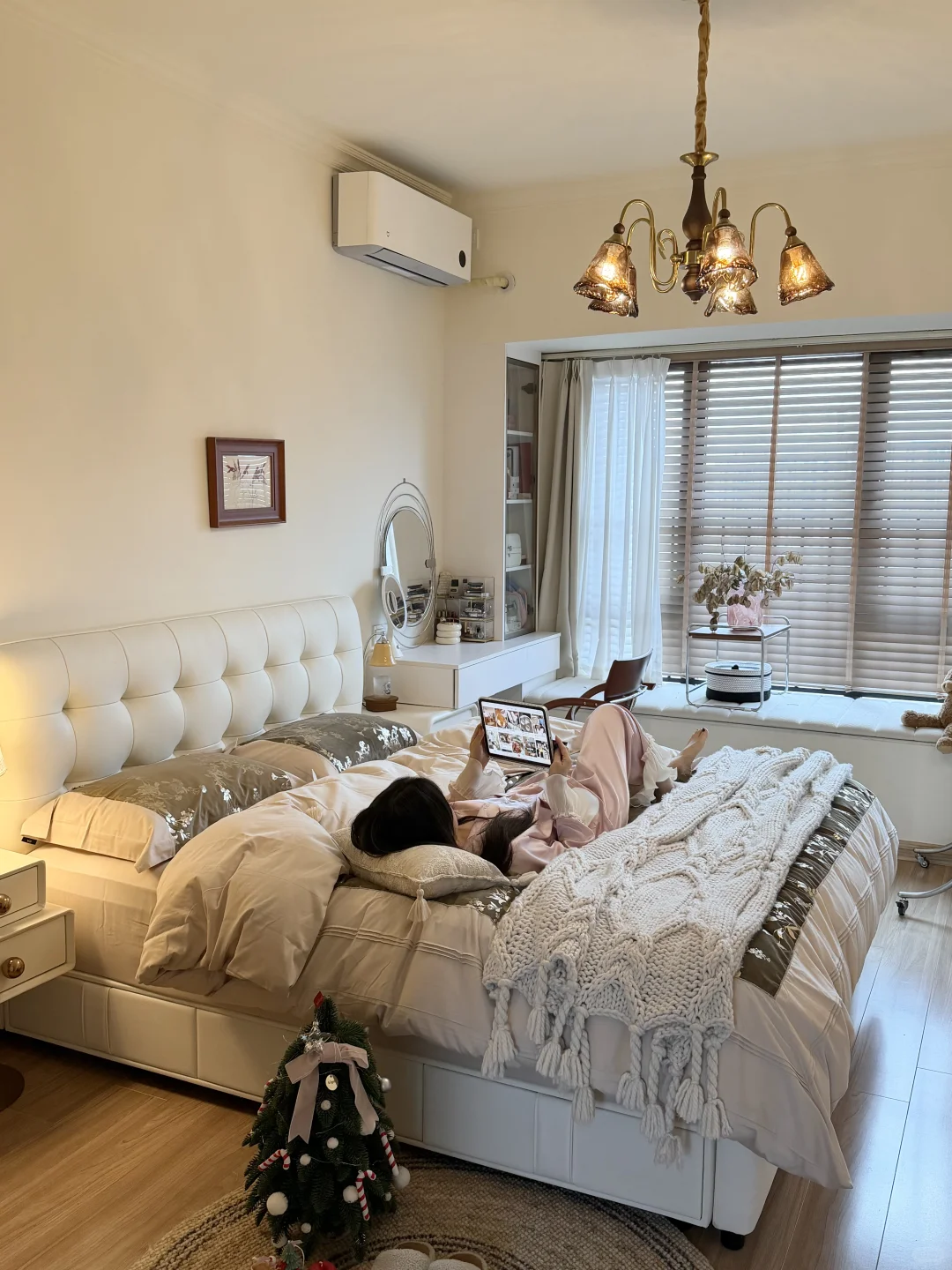 我选的是可调节吊链的款式,2.7m 的层高调到合适高度,14平小卧室也完全不压抑,还更显层次感。玻璃灯罩也是一擦就干净,对懒人来说友好度满分。