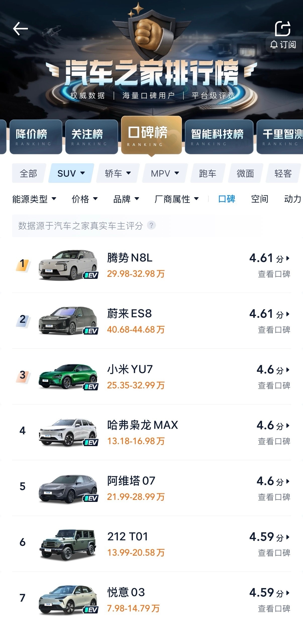 之家口碑榜,腾势N8L在SUV里排第一。30万出头的价格,大型车的尺寸、三电机、天神之眼- B、空悬,性价比很高,口碑好也是实至名归。蔚来第三代ES8排第二,比二代ES8便宜那么多,又豪华那么多,口碑好也是正常的。想不到的是,212、悦意03口碑排名也这么好?