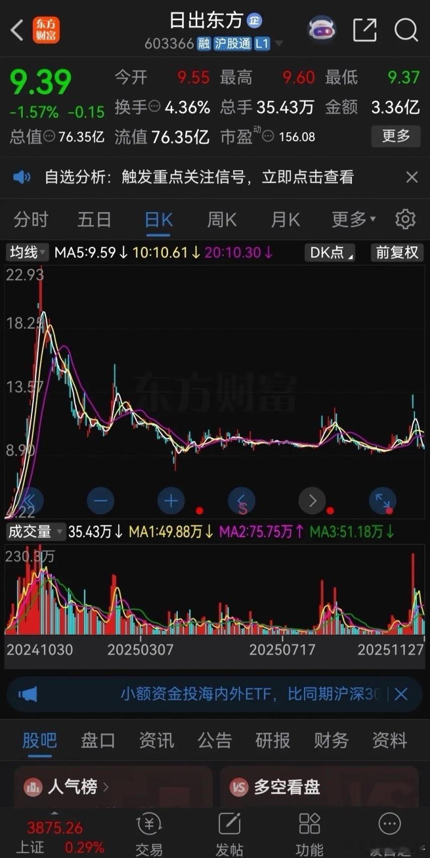 这走势是真绝!两个涨停后崩盘式下跌!日出东方,去年十一月份暴涨了一波,调整了一年,腰斩还多,前几天连续拉出两个涨停,因为调整比较充分,价格也不高,很多股民以为还会像去年一样要连板大涨,于是纷纷跑步进场。结果第三个涨停突然炸板,当天收出一根倒垂大阴线,随后股价连续跌停,从K线上看几乎是垂直下跌,自由落体,今天收盘股价报收于9.39元,不但跌回了起涨点,还向下又砸出一个大坑,这几天进场的股民全部被“活埋”!散户以为的要启动,却变成了主力的大撤退!主力预判了散户的预判!