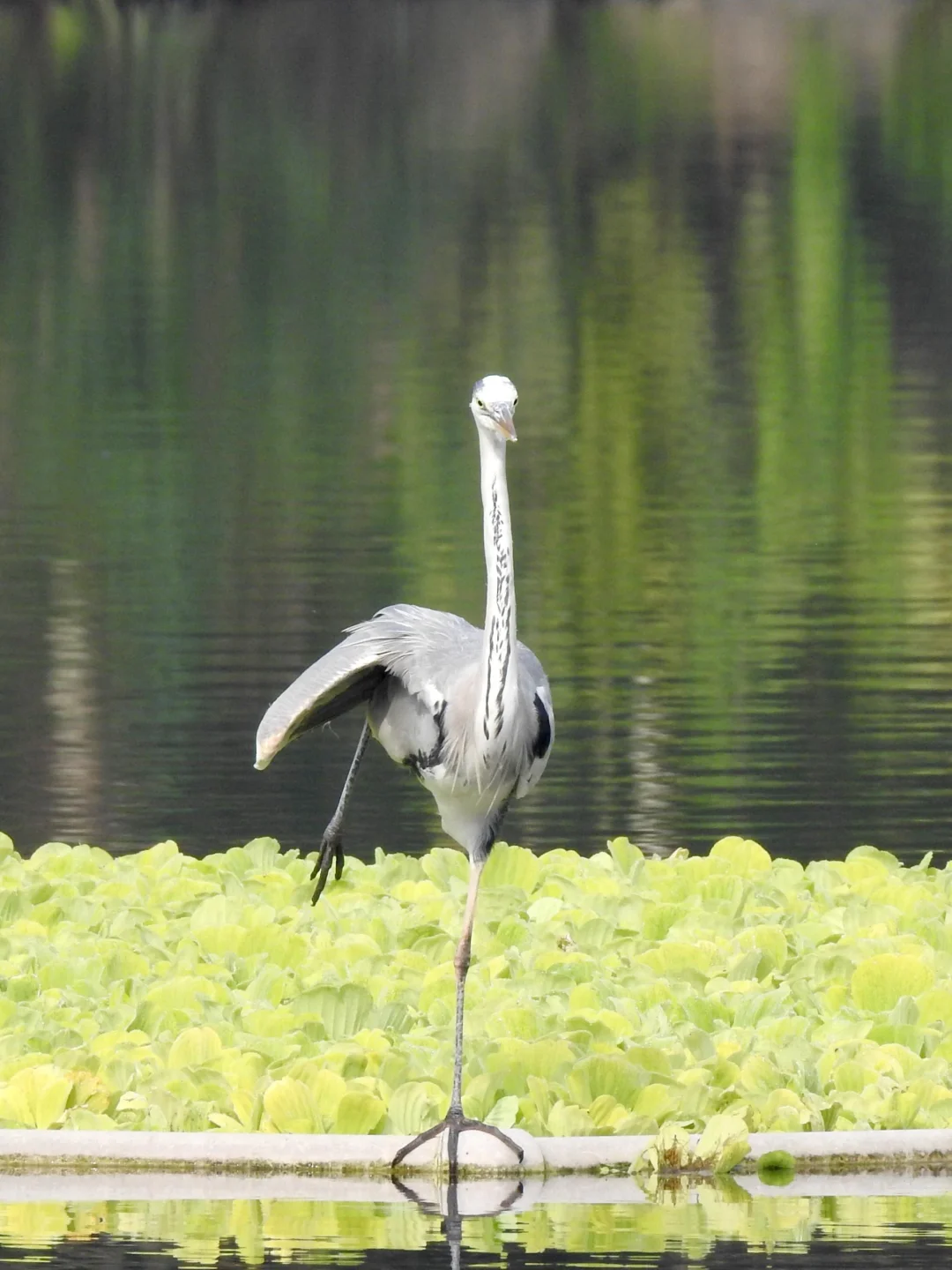 苍鹭体型较大,飞行时拍翅缓慢。它喜欢独自长时间的在水边站立不到,缩着脖子,一脚站立。它们站在那里等候过往鱼群,两眼紧盯着水面,一见鱼类或者其他水生动物到来,立刻伸直脖子抓住食物,行动极其灵活敏捷。