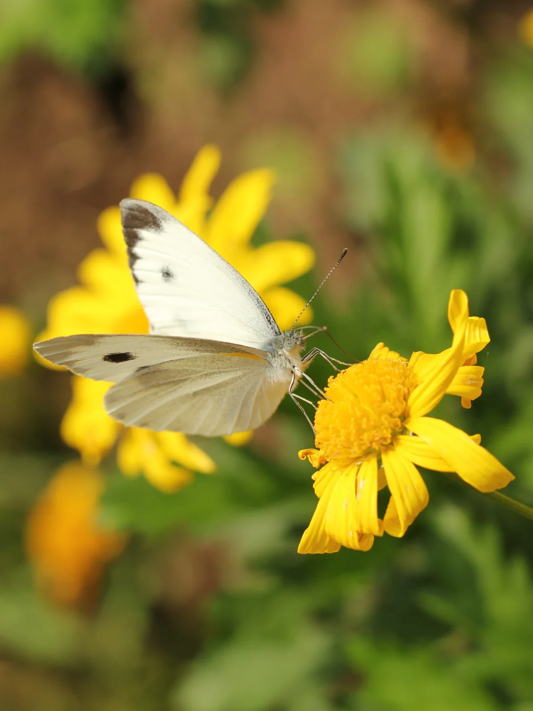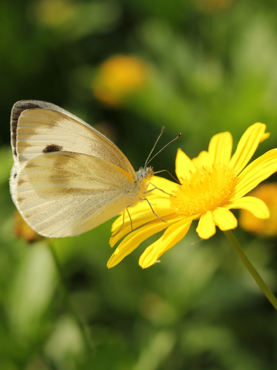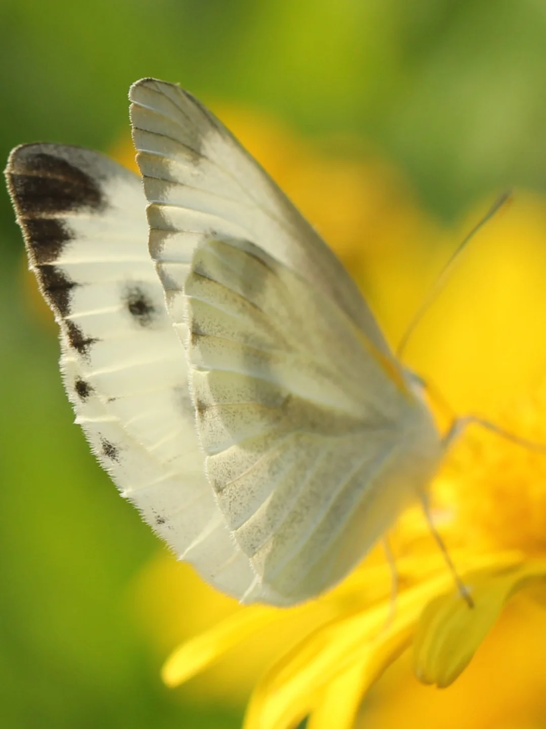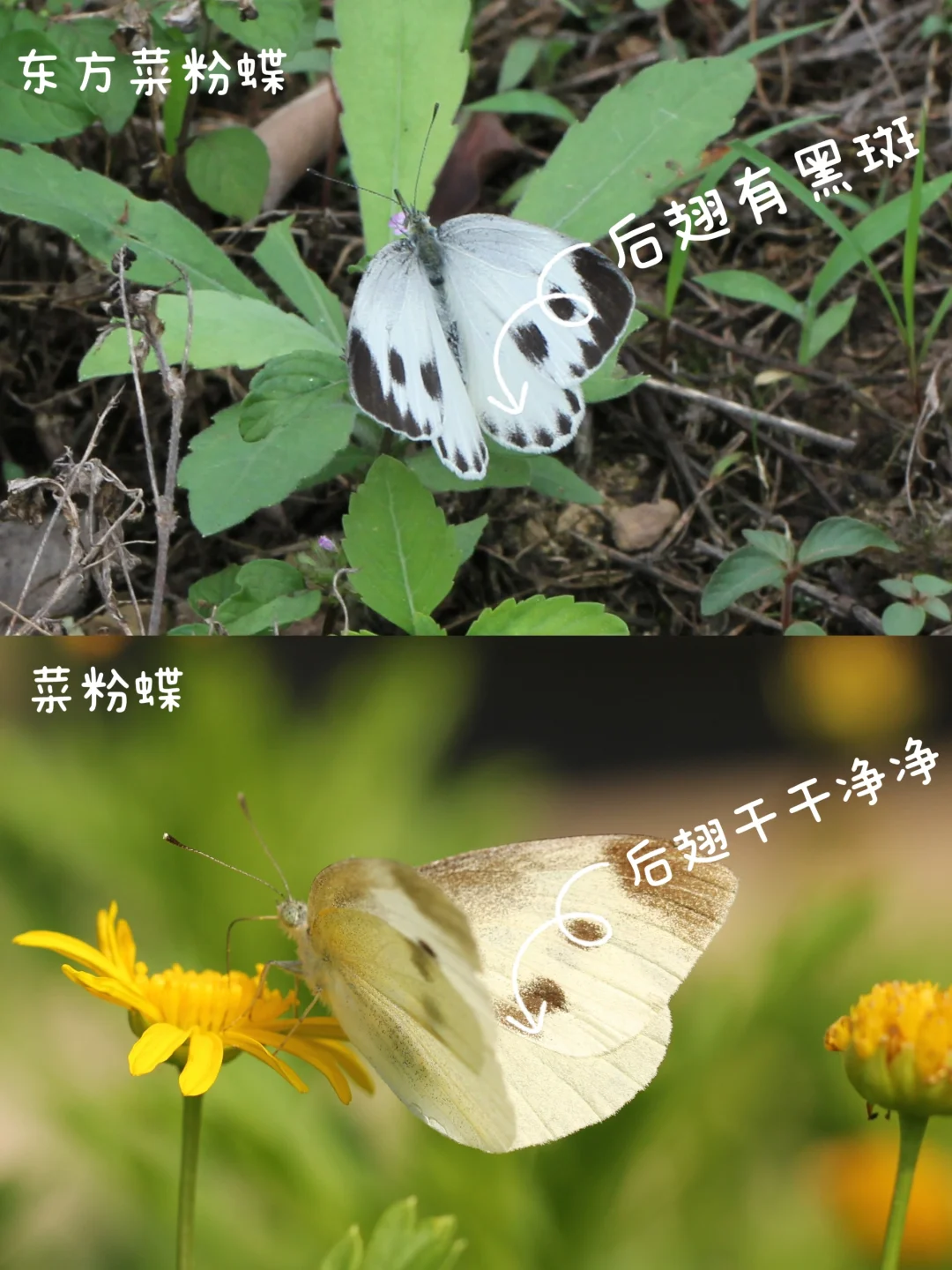 『东方菜粉蝶』 科属 粉蝶科 自然观察 东方菜粉蝶也是最常见的蝴蝶之一。在很多环境中,它的数量甚至超过菜粉蝶。 自然科普 东方菜粉蝶和菜粉蝶无论颜色、个头、身形、飞行姿态、甚至食谱都很相像。但有一个绝招可以辨别这两种蝴蝶,如果仔细观察东方菜粉蝶后翅背面外缘,会发现明显的三角黑斑,而菜粉蝶后翅是干干净净的,没有黑斑。 吃什么 十字花科植物:卷心菜、油菜、西蓝花等 (有菜粉蝶的地方一般都会有东方菜粉蝶)
