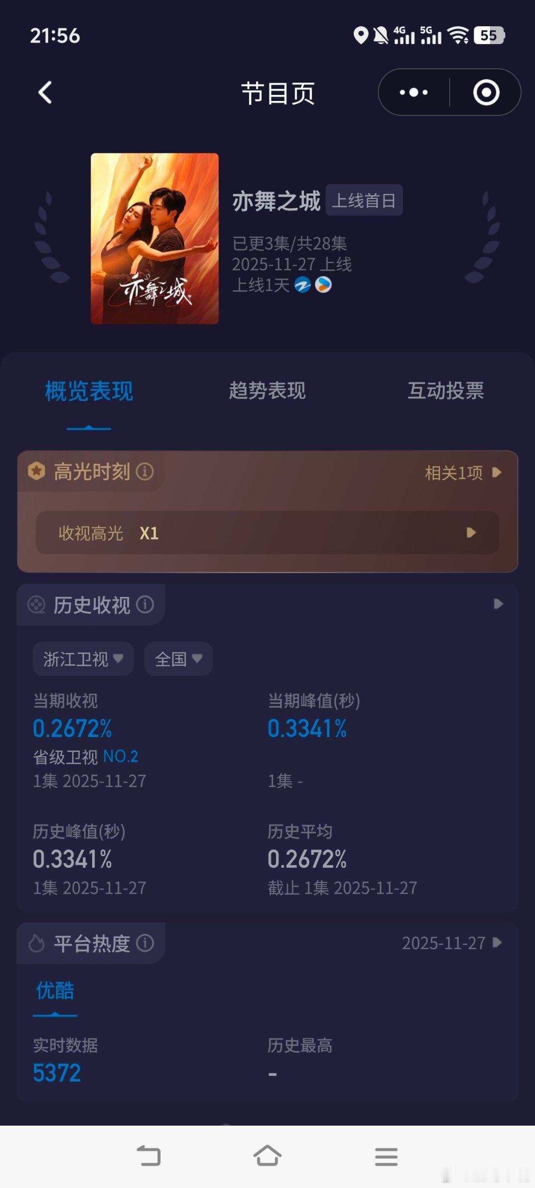 钟汉良被秦岚夸吻技红温了《亦舞之城》首播收视0.2672,峰值0.3341,走势