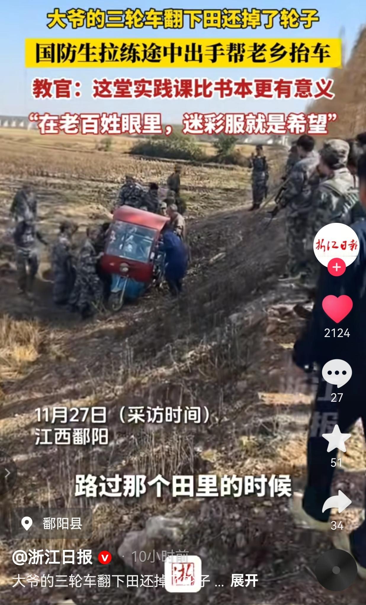 这就是国防生!为你们点赞!11月27日,江西鄱阳一群国防生拉练途径一片田地,偶遇一位大爷大爷的三轮车翻到了田里,正当大爷手无举措的时候,遇到了一群国防生。 大爷看到有一群穿迷彩服的人,比较亲切,赶紧上前寻求帮助,教官就叫了两个班的学生去帮助大爷,由于轮子掉了一个,只能徒手将车子抬上来。 好在在两个班的齐心协力下,使出了浑身解数,终于将三轮车抬了上来。 事后,大爷连忙向这群可爱的国防生表达感谢之情,国防生们心里也无比自豪。 教官也表示:大爷之所以找他们帮忙,因为,可能是因为他们身穿迷彩服吧?在老百姓眼里,迷彩服就是希望。 网友看到后评论说,这才是我们应该追的星,不追崇拜网红不追星,只崇拜人民子弟兵。 老百姓把迷彩服当成“希望”,是因为这群穿迷彩的人总在老百姓最需要的时候出现——他们的身份是国防生,但此刻的行动,让“保护”从课本里的责任,变成了实实在在的援手。 大爷遇到困难时,看到迷彩服会安心;国防生们也用行动接住了这份信任——这种“你需要,我就在”的默契,就是最生动的“军民连心”。 其实这就是最朴素的温暖:当“责任”变成了“本能”,衣服上的迷彩,就成了心里的“安心色”。 针对此事,大家有什么看法呢?欢迎大家评论区讨论留言。