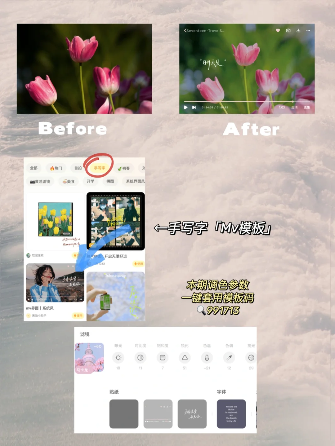 ✨今天分享一下郁金香春日氛围滤镜~MV截图这个模板太好用啦!太有电影氛围感啦!