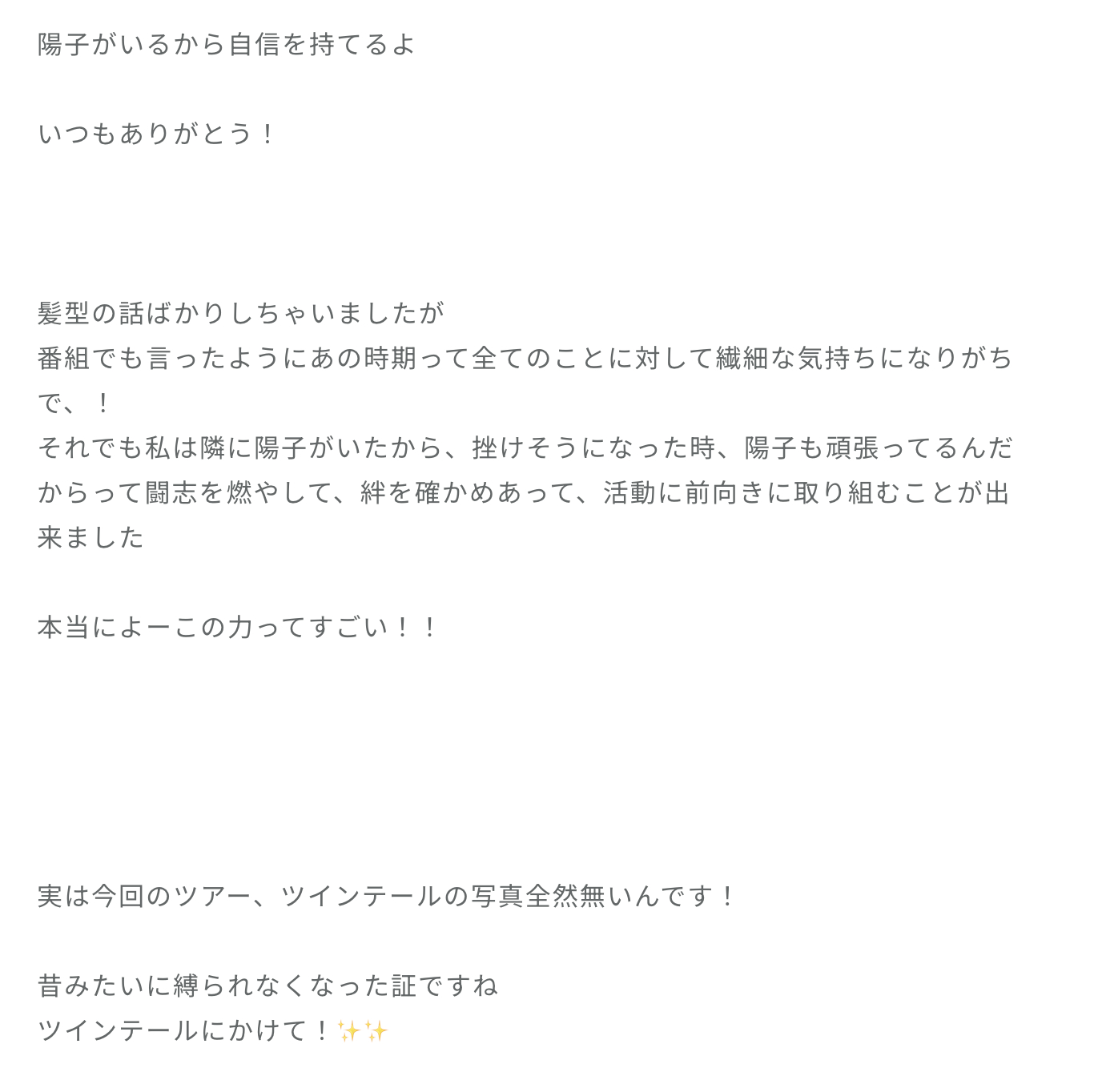 藤嶌果歩「エモさんぽ、観てくださった皆さんありがとうございます!横浜の夜景と一緒に陽子との思い出やセンター期間を振り返ったりしましたがいかがだったでしょうか!抱えている悩みも真逆な課題から生まれていたり、どこまでもシンメだなぁと放送を観ながら思っちゃいました😂」