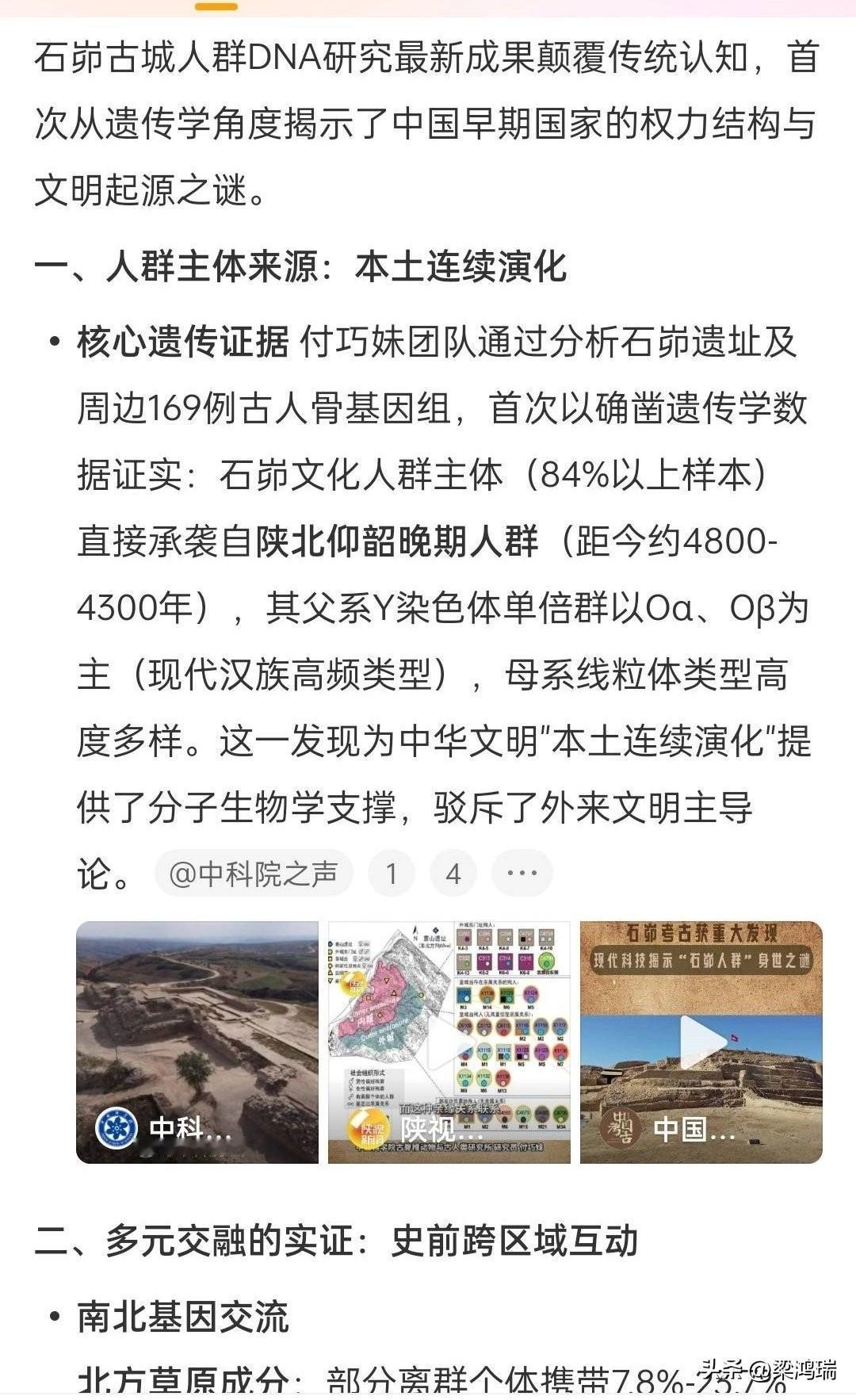 中国特大考古成果:11月26日发表在著名的科学期刊《自然》(Nature)上的完整标题是《石峁古城古代DNA揭示新石器时代的亲属关系习俗》(Ancient DNA from Shimao city records kinship practices in Neolithic China)的大文章,对169个中国古人的DNA大规模基因组进行了分析,这个发现将一举奠定石峁古城在中华上古历史的至高地位。 三大主要发现: 1、社会结构方面,研究重建了墓葬主人长达四代的家族谱系,揭示石峁社会主要围绕父系血缘关系构建等级制度。精英男性的墓葬位于亲属网络中心,而他们的妻子则来自不同的外部家族。 2、人类祭祀方面,研究发现有结构化且性别区分的人祭习俗。东门祭祀坑的受害者多为男性,而陪葬精英墓主的受害者几乎全是女性。这些受害者与墓主没有血缘关系,表明了严格的社会分层。 3、人群来源方面,石峁文化相关人群的祖先主要源自早于其至少一千年的仰韶文化相关人群,显示了区域遗传的连续性。研究还发现了来自内蒙古和其他南部地区的基因流入,支持了稻作农业向北扩张的证据。 ------- 这项研究首次提供了东亚早期国家政权权力继承模式的直接遗传学证据。 中国现在是古人类DNA分子人类学的研究中心,技术优势、挖地优势都有,几万年前的成果都有。中国很可能是上古人类的重要活动中心,驳斥了外来文明主导论。