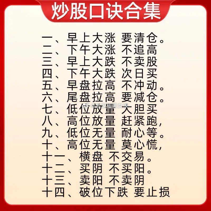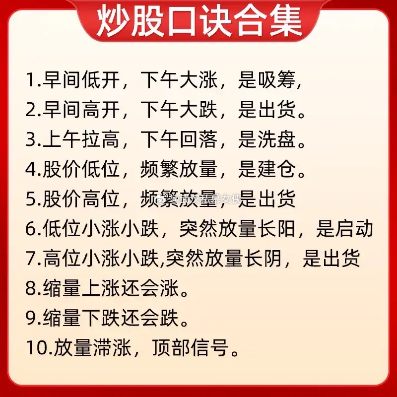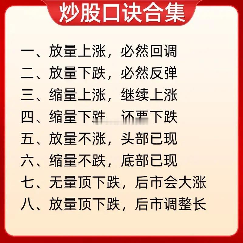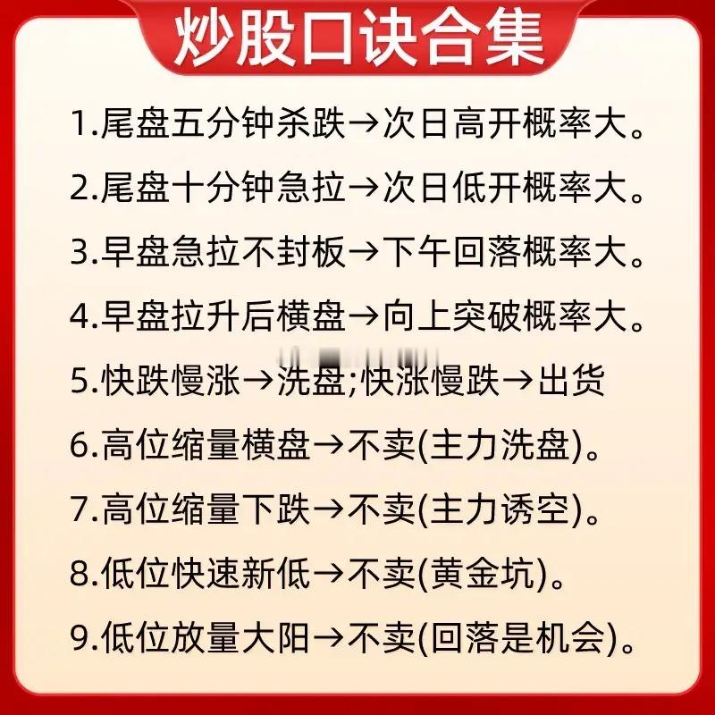 “炒股口诀合集”:第一张聚焦尾盘、早盘走势的概率判断及高低位量价形态操作:如尾盘五分钟杀跌次日高开概率大,早盘急拉不封板下午回落概率大;高位缩量横盘/下跌不卖(主力洗盘/诱空),低位快速新低/放量大阳不卖(黄金坑/回落是机会)等。第二张涵盖自身走势与大盘对比及下跌量能解读:一直小涨会大涨、连续大涨需离场;大盘跌时横盘会小涨、小涨会大涨,大盘涨时横盘会小跌、小跌会大跌;快速下跌量小是洗盘,慢慢下跌量大需跑。第三张围绕成交量与价格走势的关系:放量上涨必回调、放量下跌必反弹;缩量上涨继续涨、缩量下跌还要跌;放量不涨是头部、缩量不跌是底部;无量顶下跌后市大涨,放量顶下跌后市调整长。第四张分析不同走势对应的操作性质:早间低开下午大涨是吸筹,早间高开下午大跌是出货;上午拉高下午回落是洗盘;低位频繁放量/突然放量长阳是建仓/启动,高位频繁放量/突然放量长阴是出货;缩量涨跌延续趋势,放量滞涨是顶部信号。第五张侧重时间与涨跌的操作纪律:早上大涨清仓、下午大涨不追高;早上大跌不卖股、下午大跌次日买;早盘拉高不冲动、尾盘拉高减仓;低位放量大胆买、高位放量赶紧跑;低位无量耐心等、高位无量莫心慌;横盘不交易,买阴不买阳、卖阳不卖阴,破位下跌止损。第六张结合均线(季线、月线、十日线、五日线)判断波段与买卖点:股价踩季线做波段,季线跌破有祸;月线上穿季买进获利,月线下行本波完成;价跌月线平底部探明,月线走平观望做空;十日线不破不走人,短线看五日破掉就斩。第七张重申早盘走势性质与量价策略:早盘低开下午大涨是吸筹,早盘高开下午大跌是出货;上午拉高下午回落是洗盘;低位频繁放量建仓,高位频繁放量出货;放量滞涨是顶部信号需出货,缩量下跌是底部信号可建仓,巨量急涨必回调需出货。整体来看,这些口诀从时间节点、量价配合、大盘联动、均线指标等多维度,为股民提供快速判断走势、识别主力意图及制定操作策略的参考,强调简洁易记的实战性。