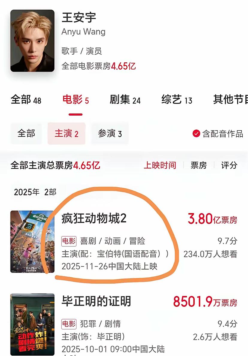 王安宇运气挺好的,因为一部《疯狂动物城2》,个人票房从8000万增至4、5亿了 更夸张的是,等电影播完,他的“实绩”票房预计能到20亿+ 现在再看,以前那些“流量”“资源咖”去大电影打酱油,东拼西凑累计个几十亿“主演电影”票房真是嘲早了 不管是不是“蹭”票房,起码他们也是真去拍了,粉丝也没少努力贡献票房。 而王安宇呢,到目前为止,就拍了一部电影,国庆档摇了大半个娱乐圈宣传也没破亿。 结果现在靠着给动画片配音,轻松累计几十亿票房,实现后来者居上,这机遇没谁了。 不过吧,配音算票房我觉得可以理解, 但是这电影明明有原音版和中配版,为啥原音票房也算他们头上,我是真不懂了……