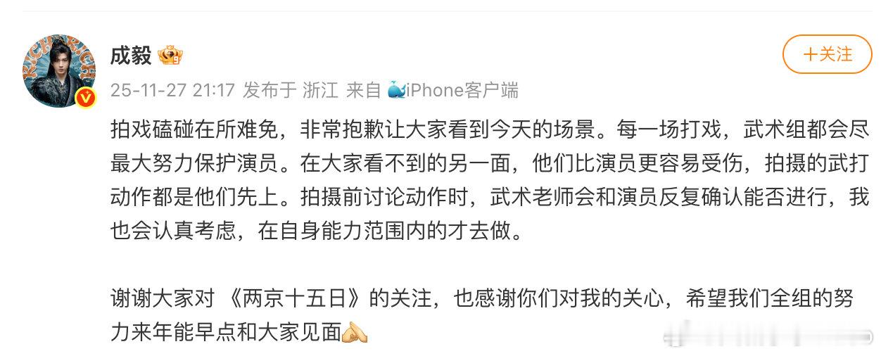 【成毅回应再次受伤,成毅为受伤道歉】11月27日,拍《两京十五日》时受伤登上热搜,晚间发文回应,“拍戏磕碰在所难免,非常抱歉让大家看到今天的场景。每一场打戏,武术组都会尽最大努力保护演员。在大家看不到的另一面,他们比演员更容易受伤,拍摄的武打动作都是他们先上。拍摄前讨论动作时,武术老师会和演员反复确认能否进行,我也会认真考虑,在自身能力范围内的才去做。谢谢大家对 《两京十五日》的关注,也感谢你们对我的关心,希望我们全组的努力来年能早点和大家见面”