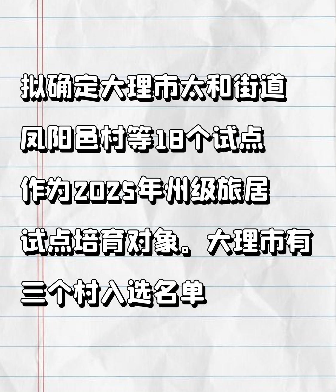 大理州2025年州级旅居试点培育对象拟定名单公布啦! 历经层层严格筛选,拟确定18个试点,其中大理市占3个,分别为太和街道凤阳邑村、大理镇中和村、喜洲镇中和邑村。 实际上,早在10月,市政协就对打造大理“旅居目的地”提案的办理情况展开调研,还前往凤阳邑村考察文艺旅居产业。此前提案曾指出,大理旅居业存在资源整合不足等问题。此次这三个村入选州级旅居试点,有望带来新的发展契机,补齐短板,推动大理旅居产业更上一层楼,让游客的居住体验更加舒适。公示期截至12月2日,大家不妨拭目以待后续发展。 大理州2025年州级旅居试点培育对象拟定名单包含18个,看看有你的家乡吗? 旅游 去有风的地方