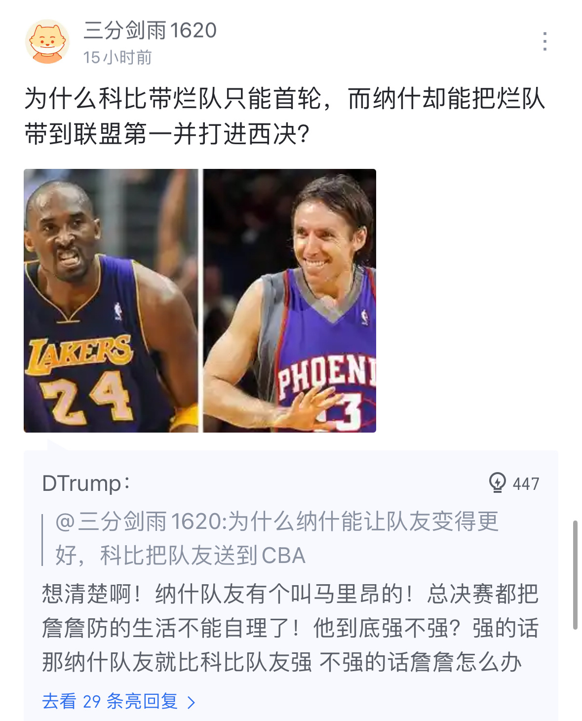 球迷发问:为什么科比带烂队只能首轮,而纳什却能把烂队带到联盟第一并打进西决?