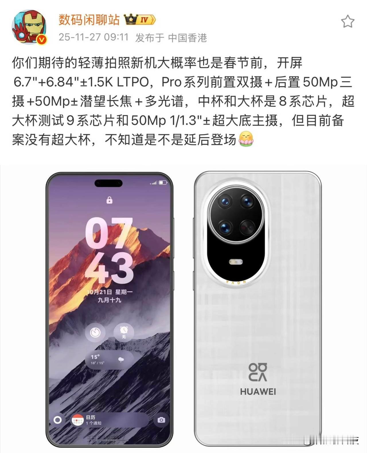这才是华为真正的销量保证~ 虽然华为mate80系列价格给足了惊喜,但毕竟依旧有着4000+的售价门槛... 而随着旗舰系列的定价调整,Nova系列的售价也势必会有波动,所以大家懂的都懂吧~ 另外配置方面从目前剧透的来看也是相当的不错。 标准版和Pro版将会搭载新一代的麒麟8系芯片(或为麒麟8020超频版),超大杯则是麒麟9系列; 将采用6.7/6.84 英寸的 1.5K 分辨率 LTPO 屏幕; 全系标配红枫原色技术,Pro以上机型或搭载第二代红枫,还有5000万像素潜望长焦; 全系电池容量将≥6000mAh,支持100W快充; 预算有限的朋友还是挺值得关注下,预计春节前发布~