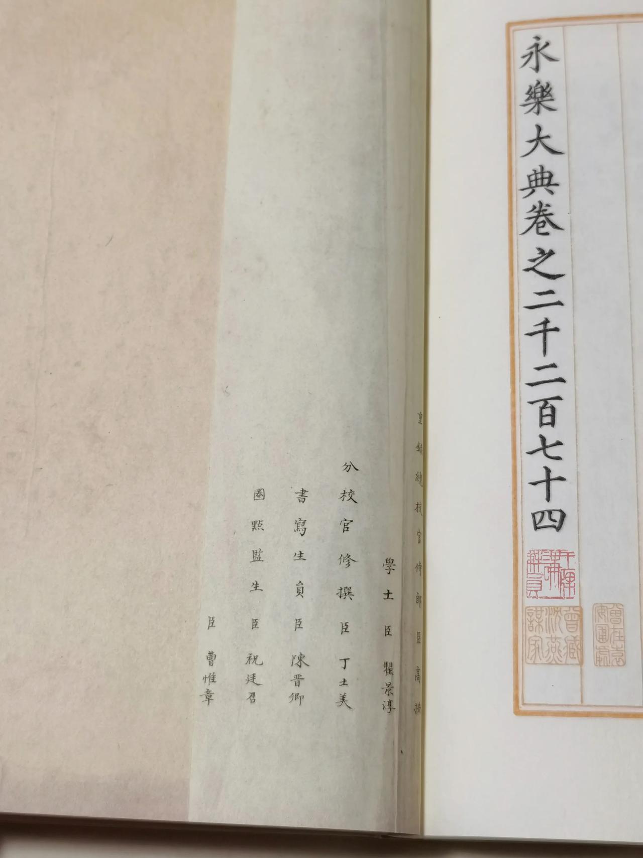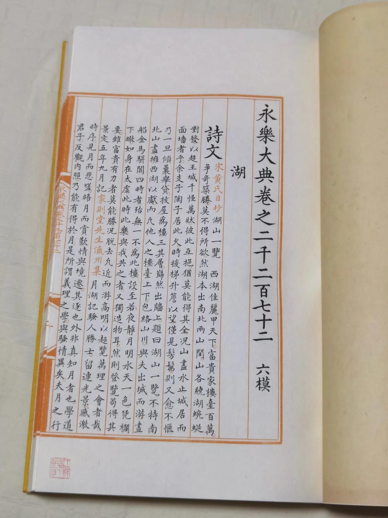 我也有《永乐大典》啦~~~ 不过,是缩印版……原大版超出购买力…… 缩印版似乎只出了这一册,全是与“湖”字有关的诗词,还原度令人满意,纸张的手感也比较真,适合充当书架的门面…… 永乐大典 国家图书馆