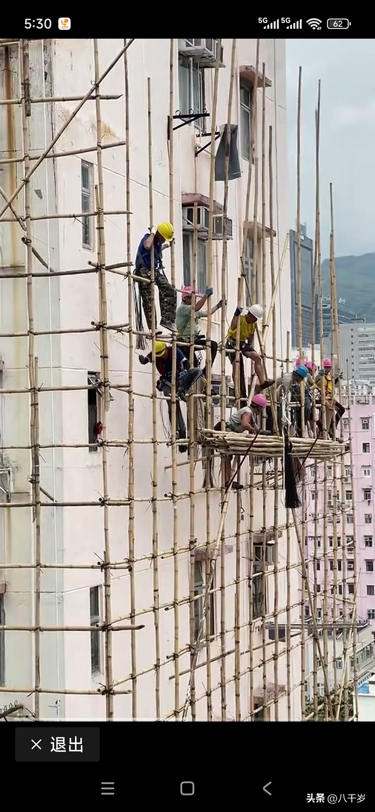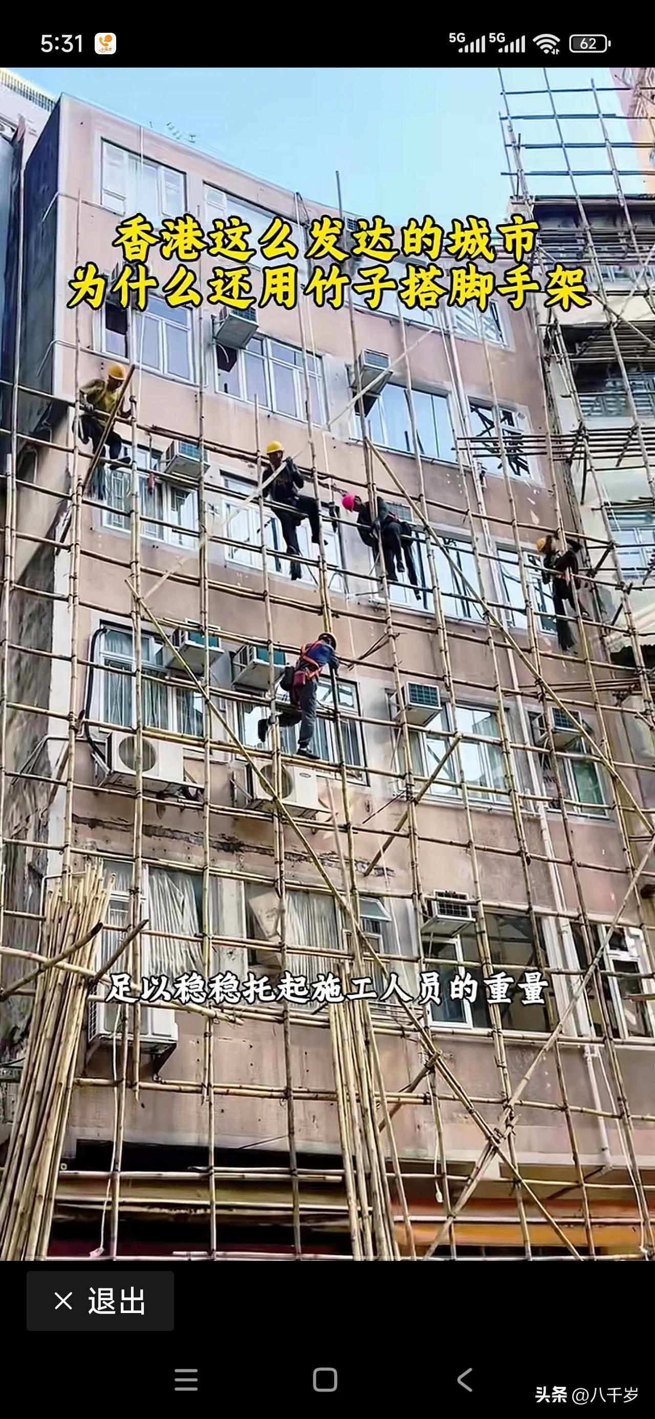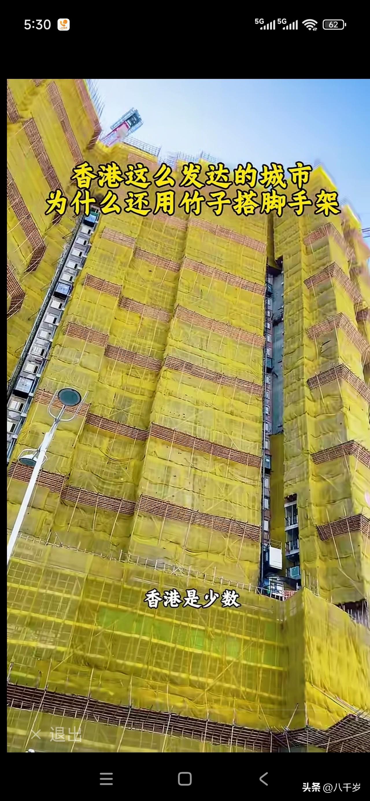 以前一直觉得香港很先进,今天才发现,原来香港盖高楼还用竹子搭脚手架,而内地早 20 年就使用钢管淘汰了竹子。一开始我也诧异,这么发达的地方咋还用这么“老古董”的东西。 不过转念又想,可能香港山多地少、楼间距小,大型机械施展不开。竹子轻、韧、占地小,搭建灵活,能适应香港独特的环境。而且竹子便宜、工期快,更能节约成本。 这么看来,竹子在香港性价比极高,这也是一种因地制宜吧。
