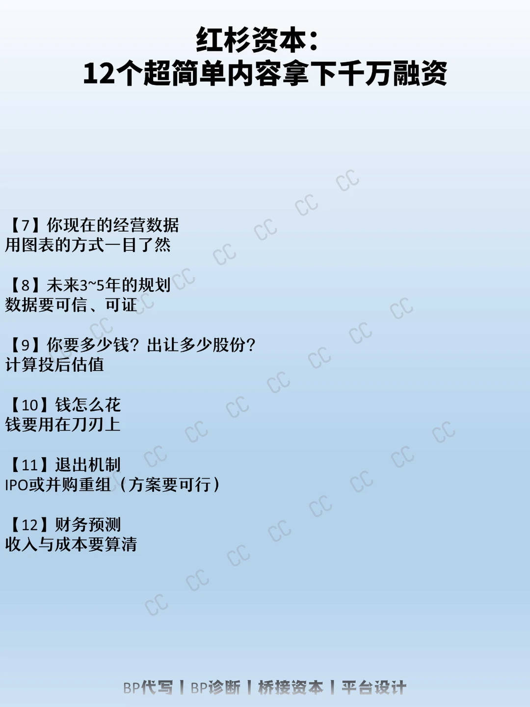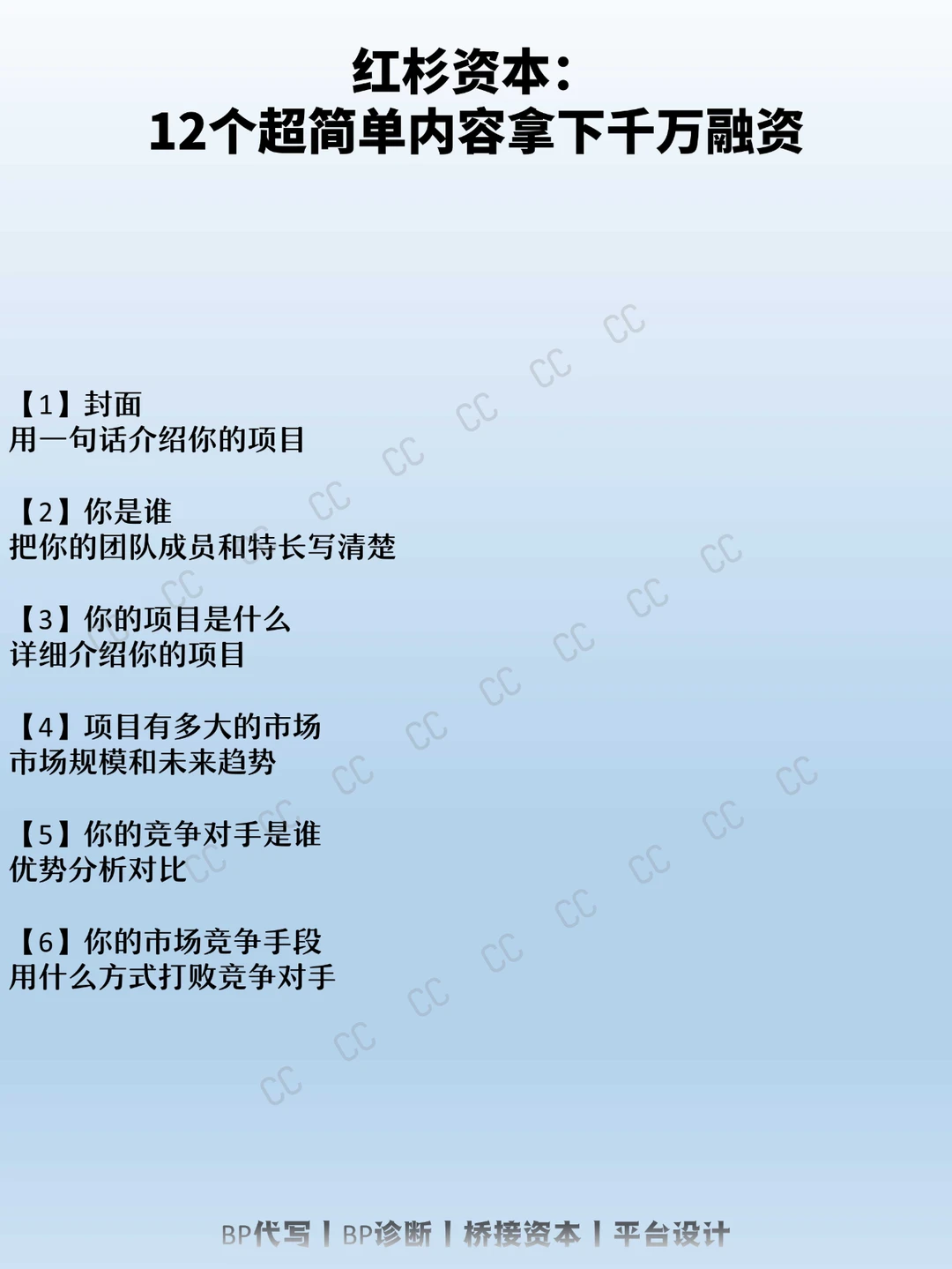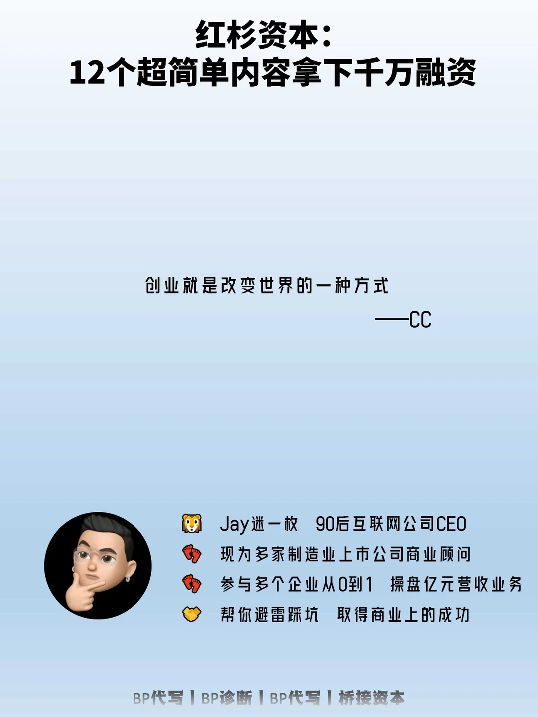 BP写不好,投资不好找 BP不是wan能的,但没有BP是万万不能的 如何写出吸引投资人的BP? 吸引投资人的商业计划书的12条主要内容: ① 封面:你是谁(业务定位) ② 你的项目是什么 ③ 项目有多大的市场 ④ 你的竞争对手是谁 ⑤ 你的市场竞争手段 ⑥ 你现在的经营数据 ⑦ 未来3~5年的规划 ⑧ 你要多少钱? ⑨ 出让多少股份? ⑩ 钱怎么花 ⑪ 退出机制 ⑫ 财务预测 商业计划书 融资 商业计划书代写 商业模式 代写BP