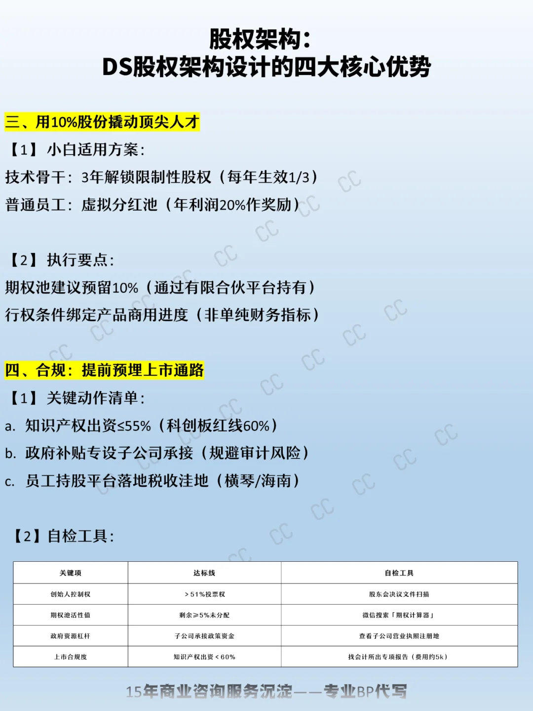 为什么股权架构设计如此重要? ✅ 控制权保障:创始人牢牢掌握企业命脉 ✅ 融资高效匹配:资源型注资结构,快速吸引资本 ✅ 人才激励优化:用10%股份撬动顶尖团队 ✅ 合规上市通路:提前布局,规避风险 创业 商业模式 商业计划书 股权架构设计 股权架构