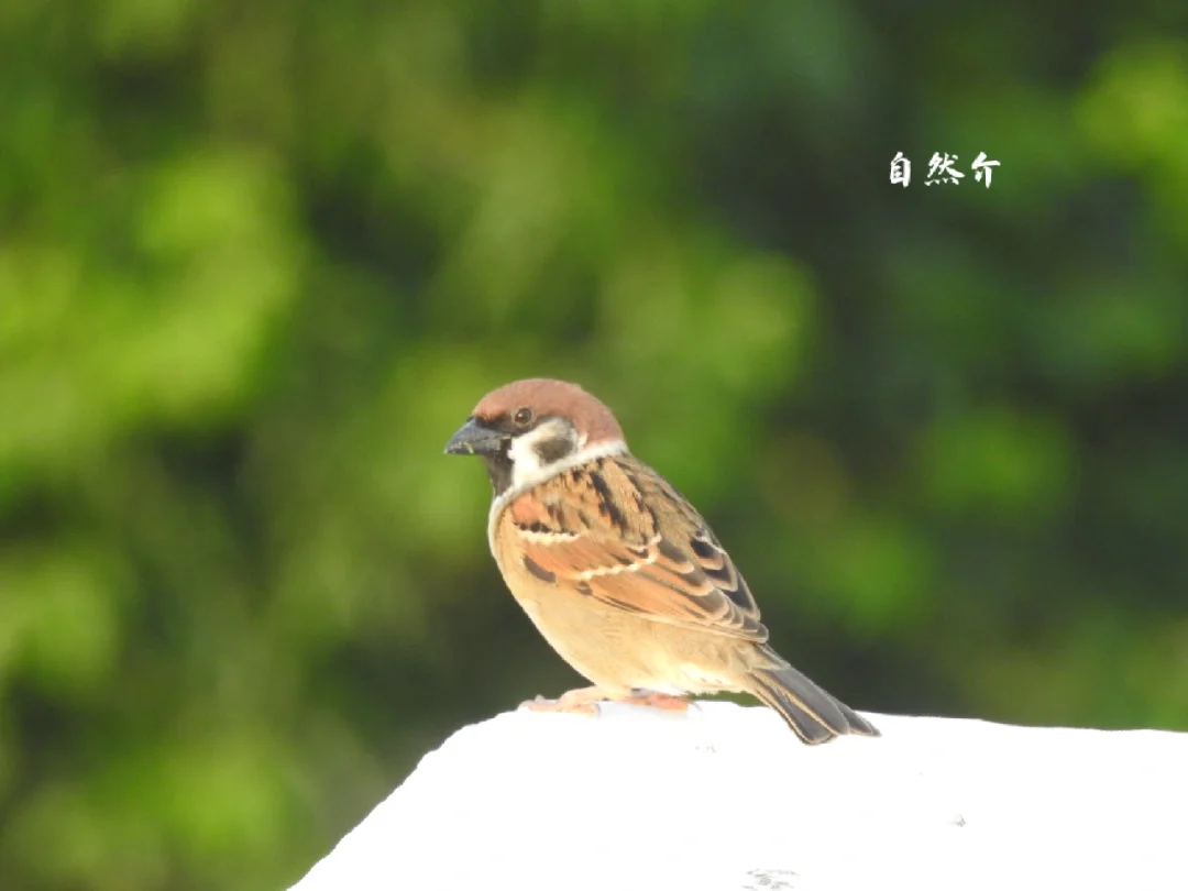 我们大家都“认识”的麻雀,其实还真不如前面几位常见。不过也不算少见啦。真正的麻雀全身大体是褐色,颈部有灰白色领环,脸颊有明显的黑色斑块。麻雀身材虽小,但是脾气不小,它们喜欢在地面上蹦来蹦去找吃的,还可能会为了食物或地盘和其他鸟打架。