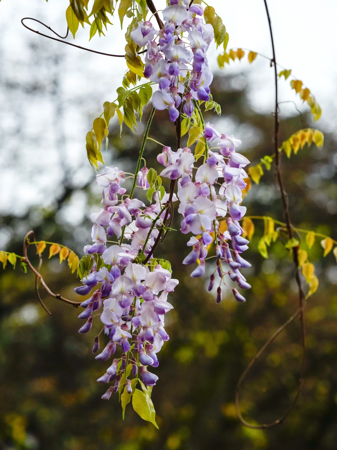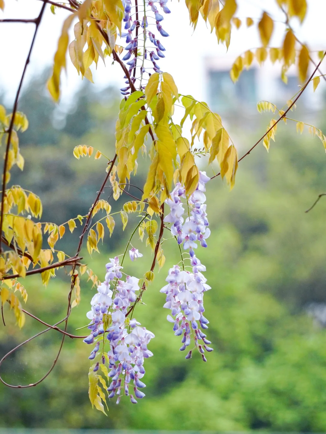 “紫”和“藤”二字,点出了紫藤最为典型的两个特征:花开为紫,茎绕为藤。而紫藤非常的“懒”,当其他春花盛开的初春之时,紫藤还是光秃秃的,看上去没有一点生气。直到仲春时节,紫藤才从酣睡中醒来,从枝头上抽出几片羽状的叶片,中间还夹杂着一些青绿色的小穗——这就是紫藤的花序。
