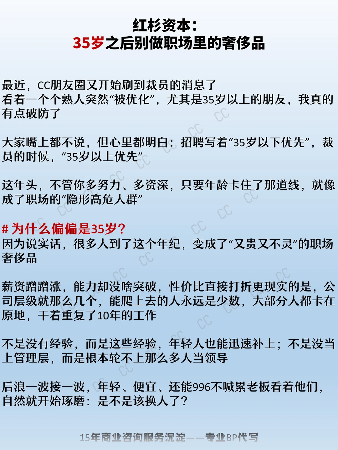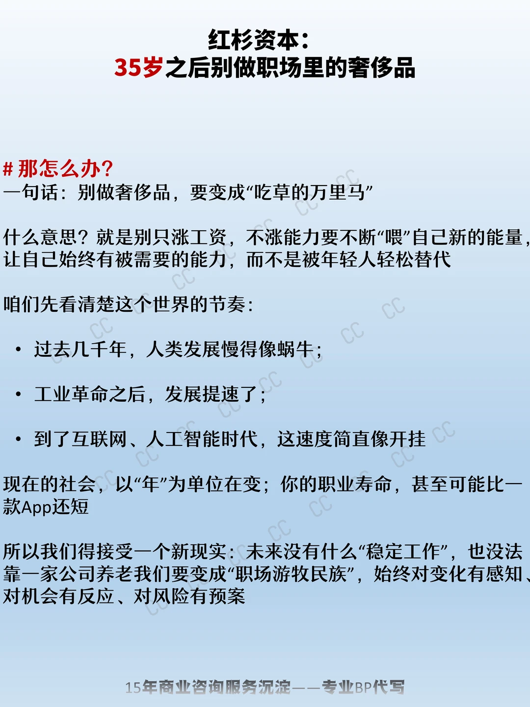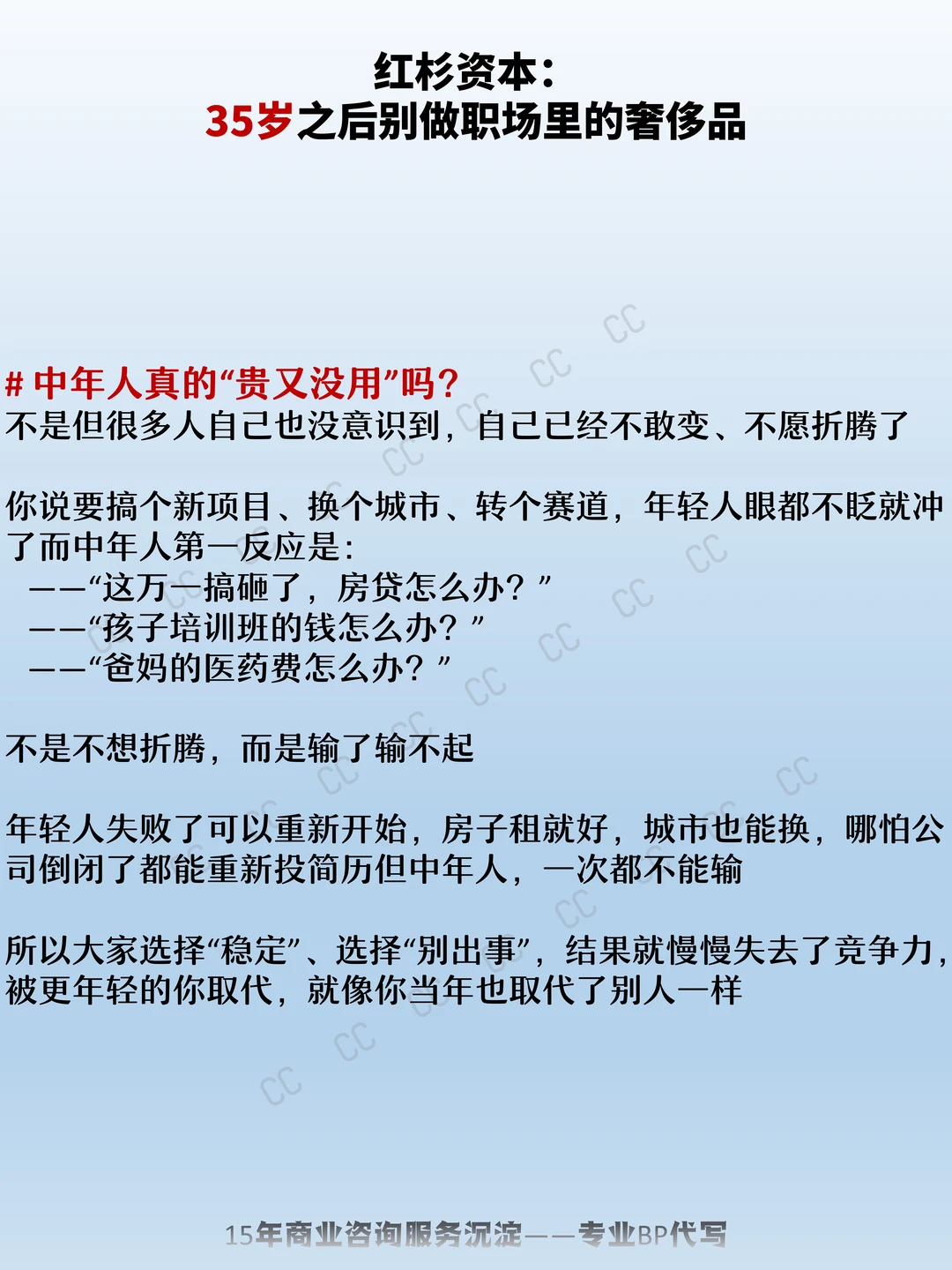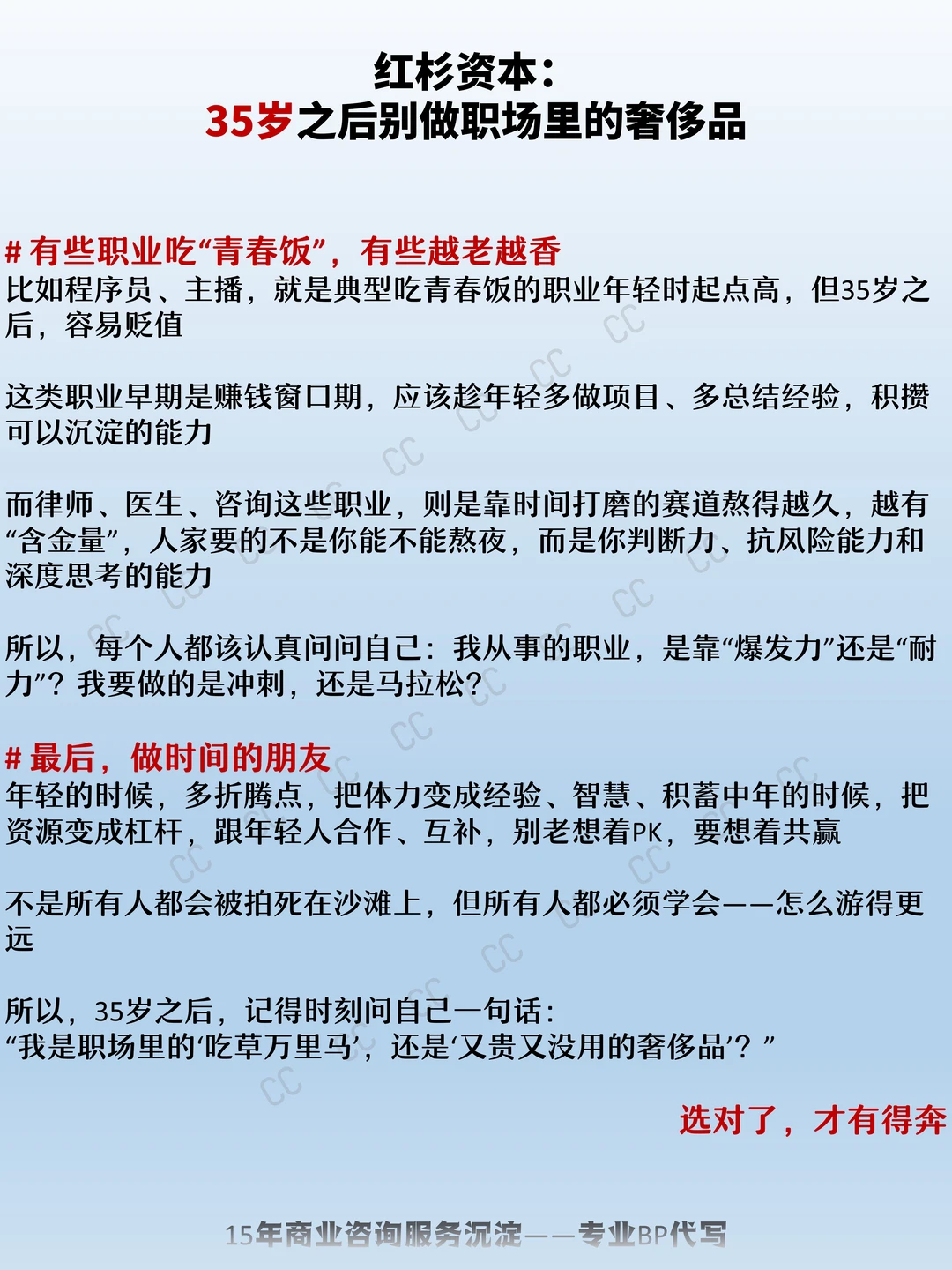 年轻的时候,多折腾点,把体力变成经验、智慧、积蓄 中年的时候,把资源变成杠杆,跟年轻人合作、互补,别老想着PK,要想着共赢 不是所有人都会被拍死在沙滩上,但所有人都必须学会——怎么游得更远 所以,35岁之后,记得时刻问自己一句话: “我是职场里的‘吃草万里马’,还是‘又贵又没用的奢侈品’?” 创业 红杉资本 35岁 35岁即将失业 35岁职场