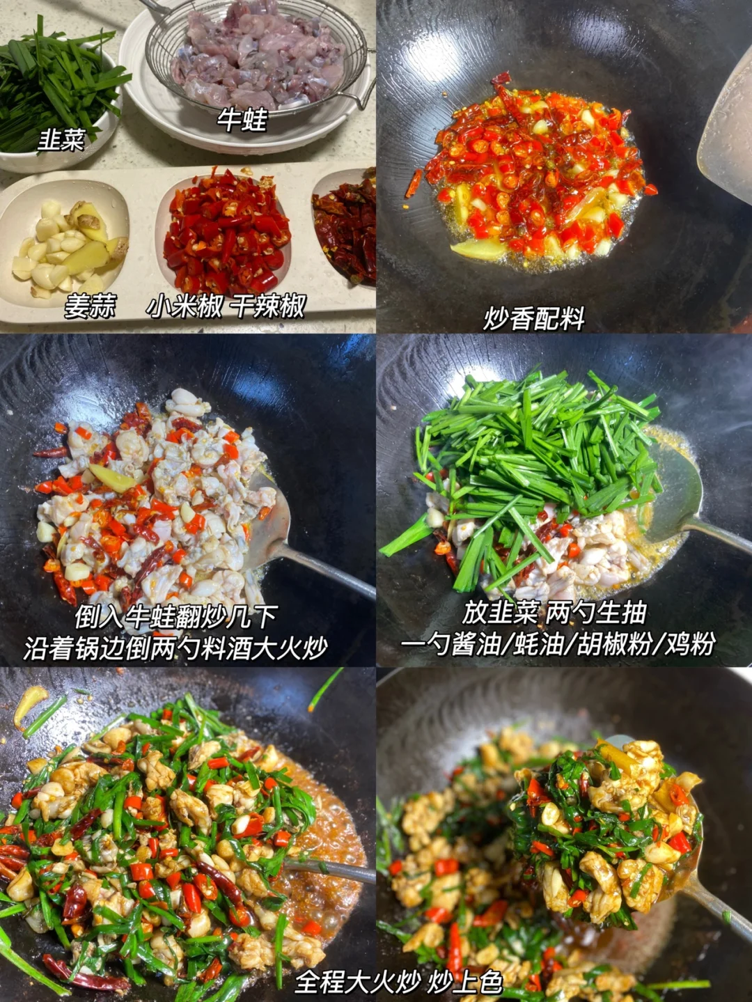 2⃣️:锅里倒油炒香姜蒜 小米椒 干辣椒 🌶️ ,然后放牛蛙炒两下 沿着锅边倒两勺🥄料酒 大火翻炒一分钟挥发掉料酒的味道,关火放韭菜 两勺生抽/一勺酱油 蚝油 胡椒粉 鸡粉开大火炒匀,炒两分钟。起锅前再淋一点藤椒油