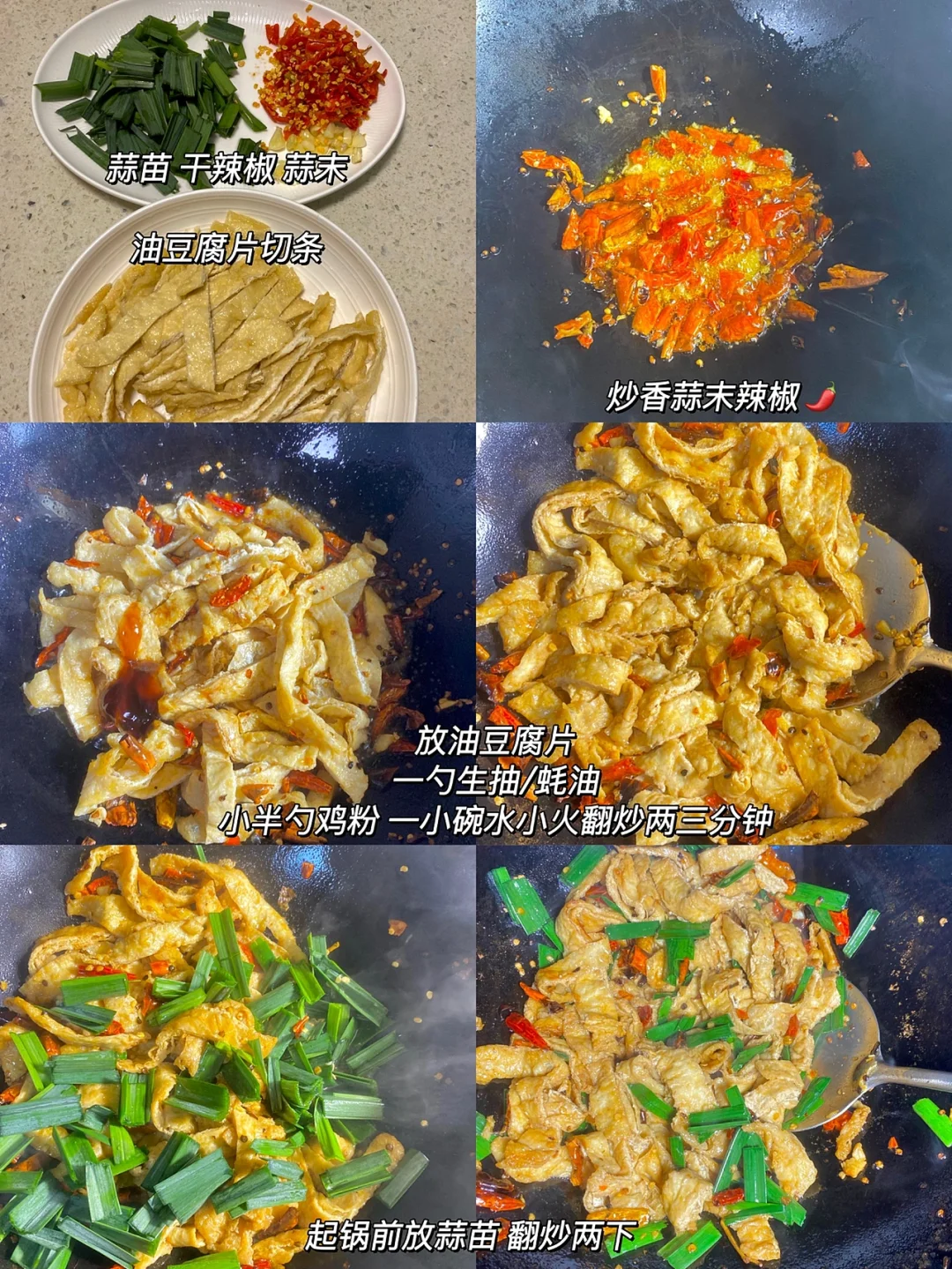 吃起来比豆泡更入味[萌萌哒R] ✨食材:油豆腐片 干辣椒 蒜末 蒜苗 1⃣️:油豆腐片切条,干辣椒蒜末尽量切碎。锅里倒油,放辣椒蒜末小火炒出辣味,放油豆腐条 一勺生抽/蚝油/小半勺鸡粉。一小碗水中小火翻炒3分钟左右。 2⃣️:起锅前放蒜苗叶 大火再翻炒几下。 先尝尝再加盐~我觉得味道足够了 没有加 配了两碗粥[笑哭R][笑哭R]吃撑了 好好吃饭呀🤘🏻