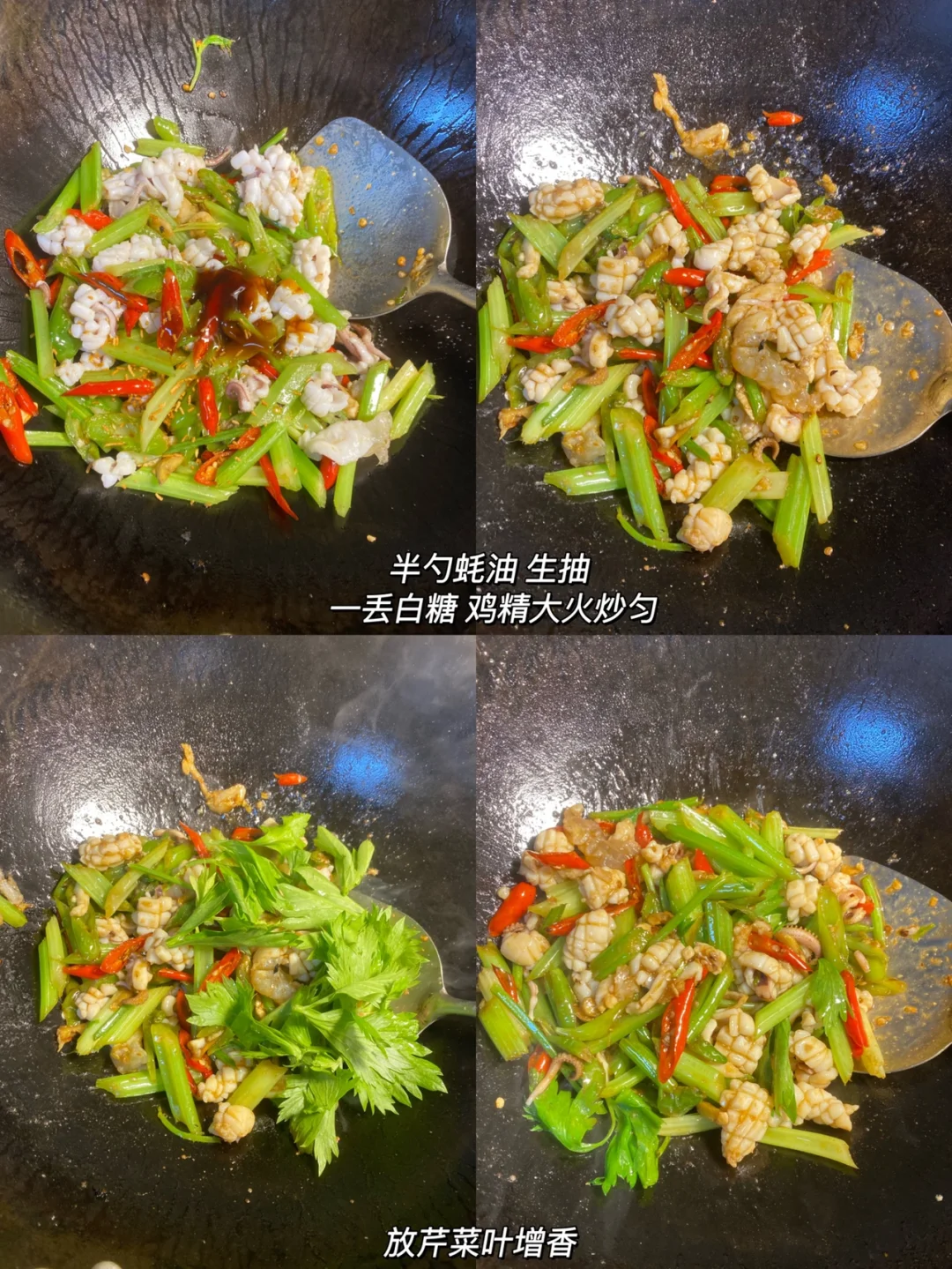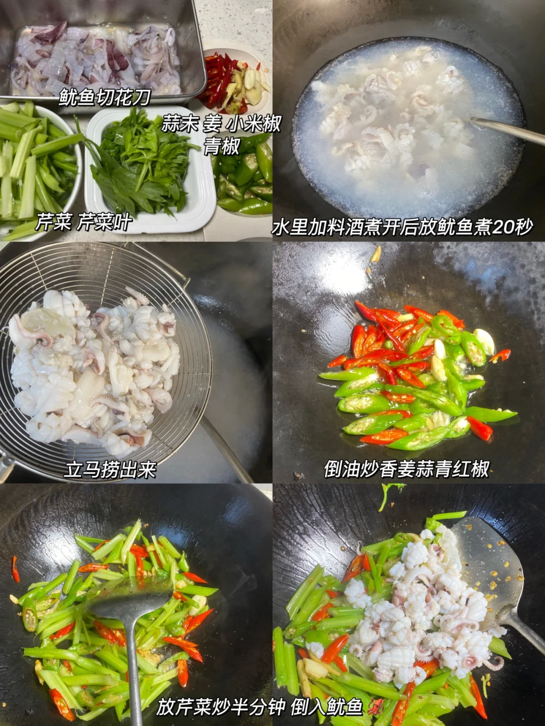 芹菜 鱿鱼各有各的味道 都好吃[赞R] ✨食材:鱿鱼 芹菜 蒜 姜 青红椒 1⃣️:鱿鱼牙齿还有里面的墨去掉。🦑对半切开 里面那面切花刀再切成小块。芹菜斜刀切段,芹菜叶留一点下来。 2⃣️:锅里水烧开加料酒 放鱿鱼煮20秒,卷起来后立马捞出来。锅里倒油放姜蒜 青红椒,倒入芹菜放一丢丢盐炒半分钟,放鱿鱼 半勺生抽/蚝油/一丢白糖 鸡精大火炒出香味。起锅前放入芹菜叶增香。 鱿鱼越新鲜做出来越好吃😋 好好吃饭呀🤘🏻