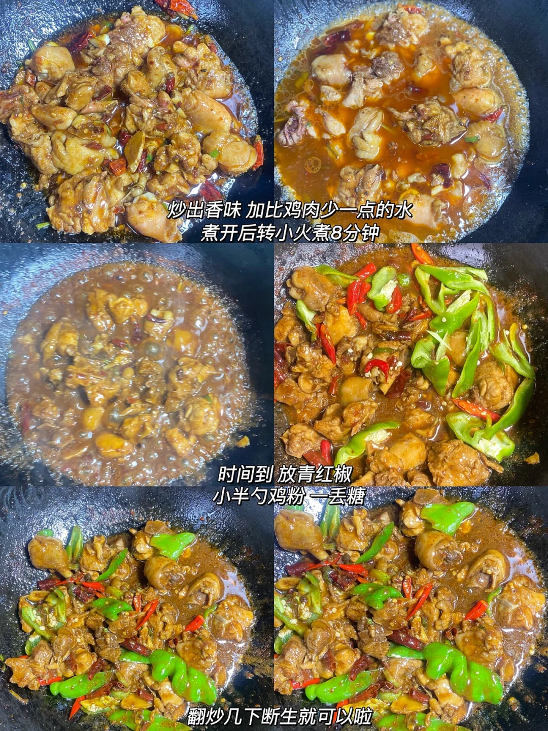 3⃣️:加一碗水(比鸡腿少一点的量)大火煮开转小火盖上锅盖焖煮8分钟。时间到,放青红椒 小半勺鸡粉/一丢丢白糖翻炒匀。