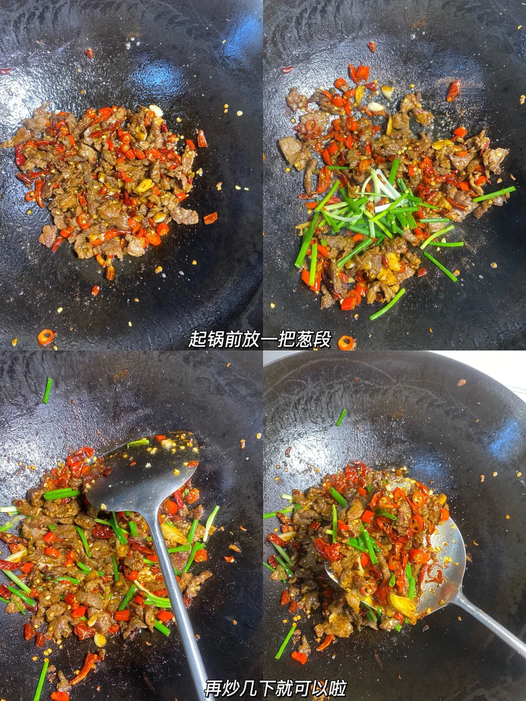 麻辣干香,越吃越上头 太下饭了[色色R] ✨食材:牛里脊 姜 蒜 干辣椒 小米椒 葱段 米酒 1⃣️:牛肉切薄片(可以放冰箱冷20分钟再切)再改刀能自己喜欢的大小。姜蒜 干辣椒 小米椒切碎,葱切段备用 2⃣️:锅里油烧热,放牛肉翻炒变色后转中火炒三分钟(锅受热不一样,有点微焦的状态就可以啦)放姜蒜 米酒 干辣椒/小米椒炒一分钟。 3⃣️关火放一勺生抽🥄蚝油/一点点酱油/胡椒粉/鸡粉/盐调味大火炒匀。起锅前撒一把葱段配色增香。 越吃越上头~我觉得都可以当追剧小零嘴了[笑哭R] 好好吃饭呀🤘🏻