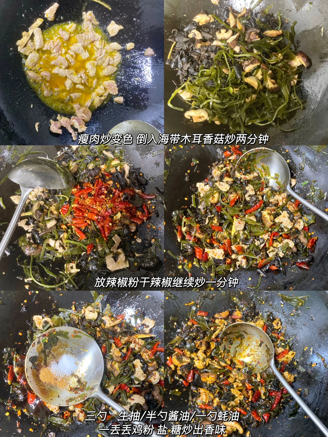 2⃣️:锅里倒油放瘦肉炒变色再把香菇海带 木耳放进去炒两分钟,然后下入干辣椒辣椒粉炒一分钟关火,加三勺生抽/半勺酱油/一勺蚝油 一点鸡粉 盐 糖开大火炒香加水烧开 (根据粉的量来加水调味,后面味道不够可以补 🥄大小就是一次性勺)
