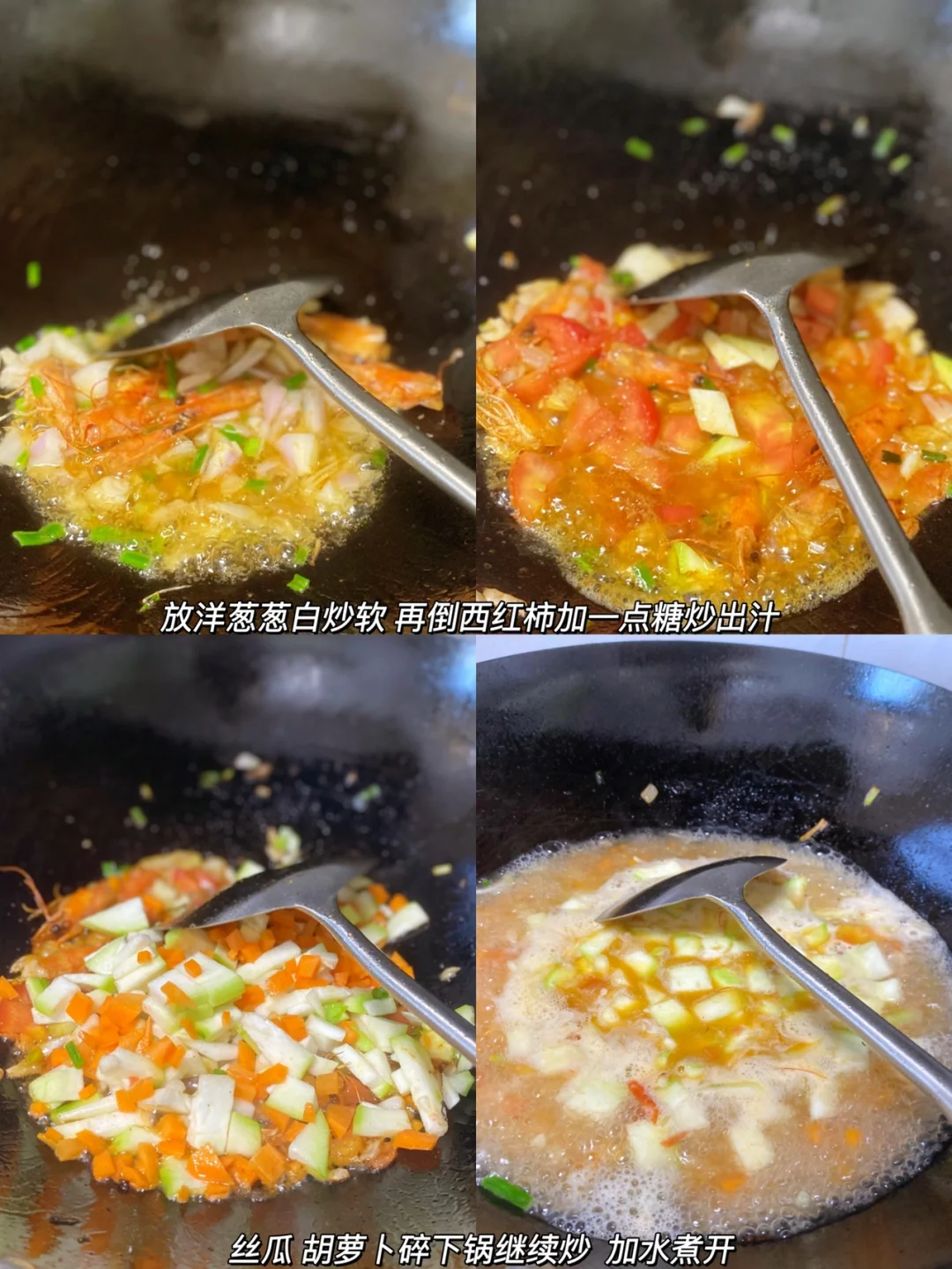 2⃣️:热锅冷油放虾头炒出虾油,倒洋葱炒软,然后放西红柿 加一点糖炒出汁,下丝瓜胡萝卜继续翻炒变色,倒入两小碗水,一勺蚝油/一点盐调味。大火煮开后盖锅盖转小火煮10分钟