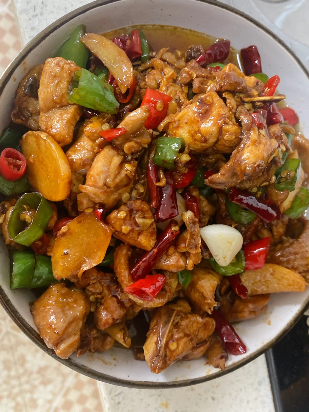 ✨食材:鸡 姜片 蒜粒 干辣椒 🌶️小米椒 青椒 1⃣️:鸡切小块用热水洗净 配料切好备用 蒜粒姜片多些 2⃣️:锅内倒油 放入姜片爆香 倒入鸡肉翻炒 沿着锅边倒入两勺料酒翻炒一下 加入半勺十三香粉炒均匀 3⃣️:放入干辣椒 小米椒 蒜粒 加半勺酱油 一勺生抽蚝油翻炒上色。 4⃣️:加入一丢丢白糖提鲜,放入青椒圈 淋一点花椒油再大火炒几分钟。(根据个人口味加盐 鸡精) 简单快速的一道下饭菜 鸡买的时候让摊主剁小些 更入味[赞R]记得多煮点米饭🍚 好好吃饭呀[大笑R]