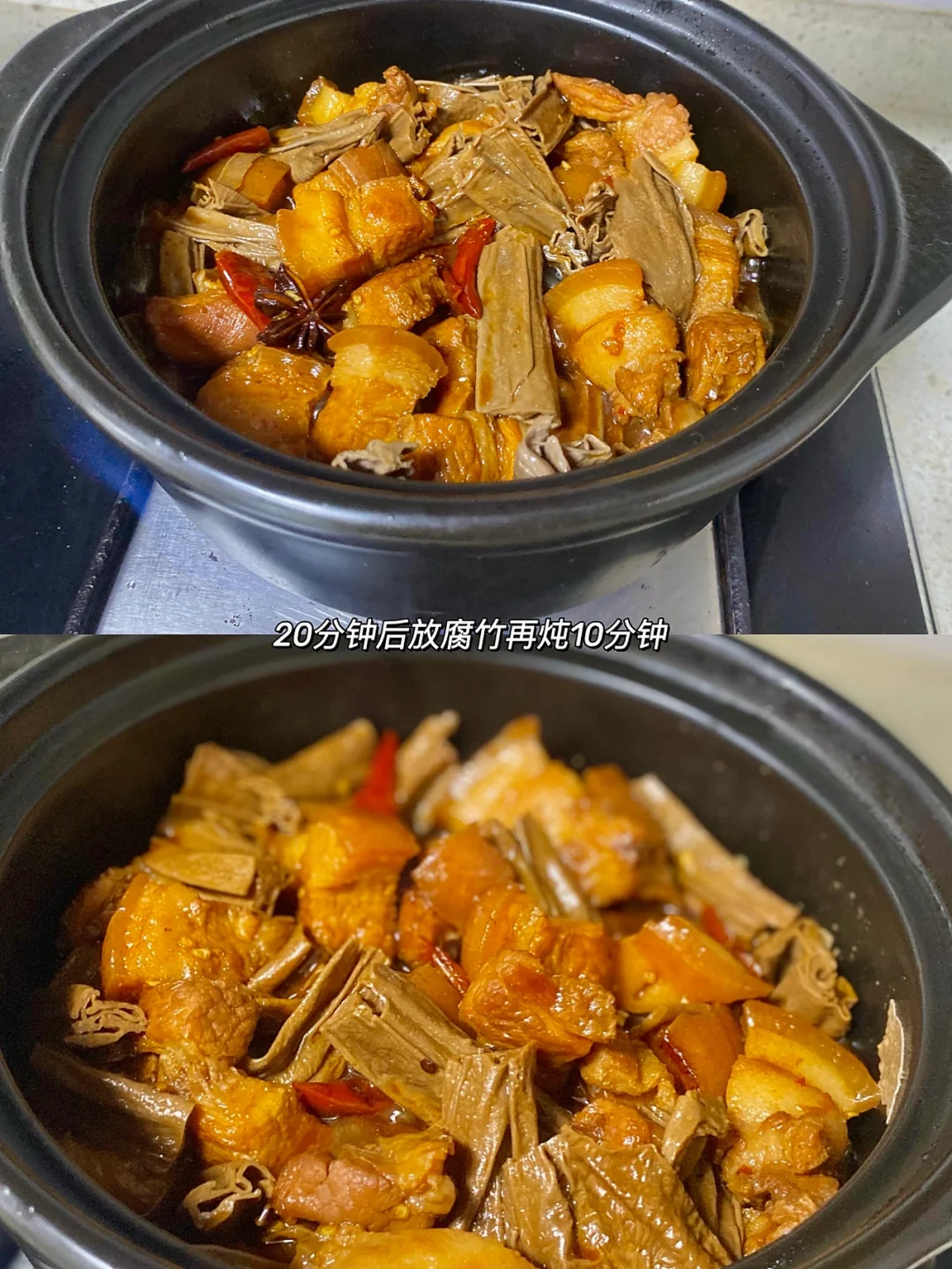 4⃣️:提前10分钟放入腐竹一起炖。 记得观察水量 稍微留点汤汁哦。