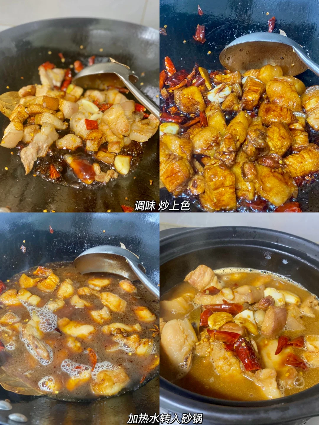 3⃣️:方一勺🥄半酱油/三勺生抽/两勺蚝油/六七颗冰糖,炒上色后加足量的热水大火煮开转最小火煮30分钟(我直接倒砂锅慢慢炖了,总感觉砂锅炖的更香[害羞R])