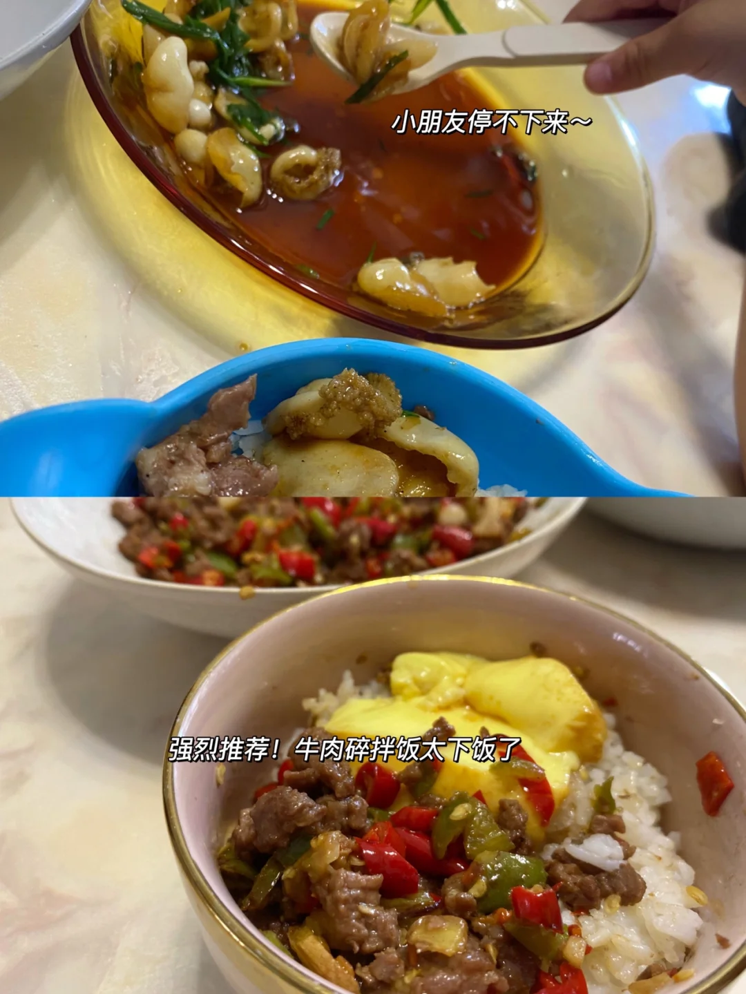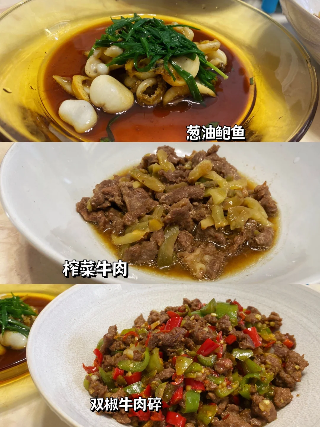 今日母子俩午餐:双椒碎牛肉 榨菜蒸牛肉 葱油鲍鱼 水蒸蛋