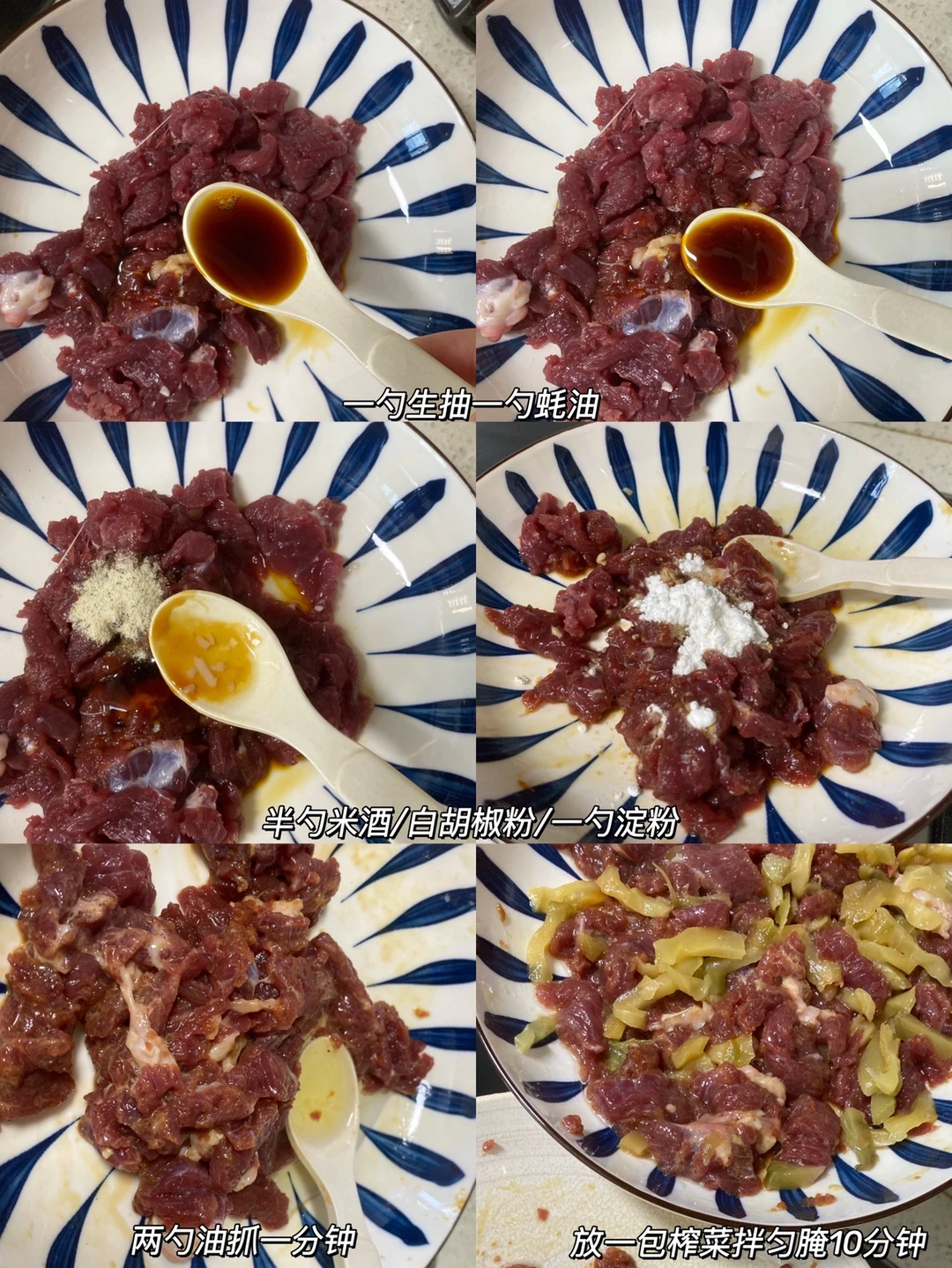 1⃣️:牛肉先切片再切条 改刀切小丁再剁几下。放一勺生抽/蚝油/半勺鸡精/胡椒粉/一勺生粉抓匀。再放一勺油继续抓一分钟,放一边腌10分钟。