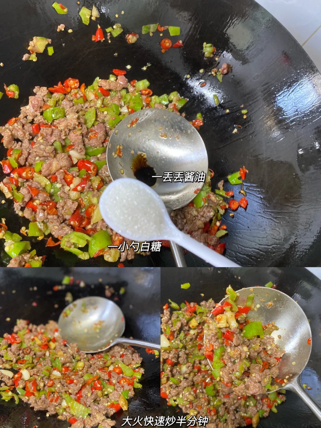 2⃣️:青椒小米椒全部切碎 热锅冷油放姜蒜辣椒,放一点点盐 把辣椒炒软,倒入牛肉大火炒变色。关火 放一丢丢酱油 一小勺白糖 开大火快速炒半分钟。