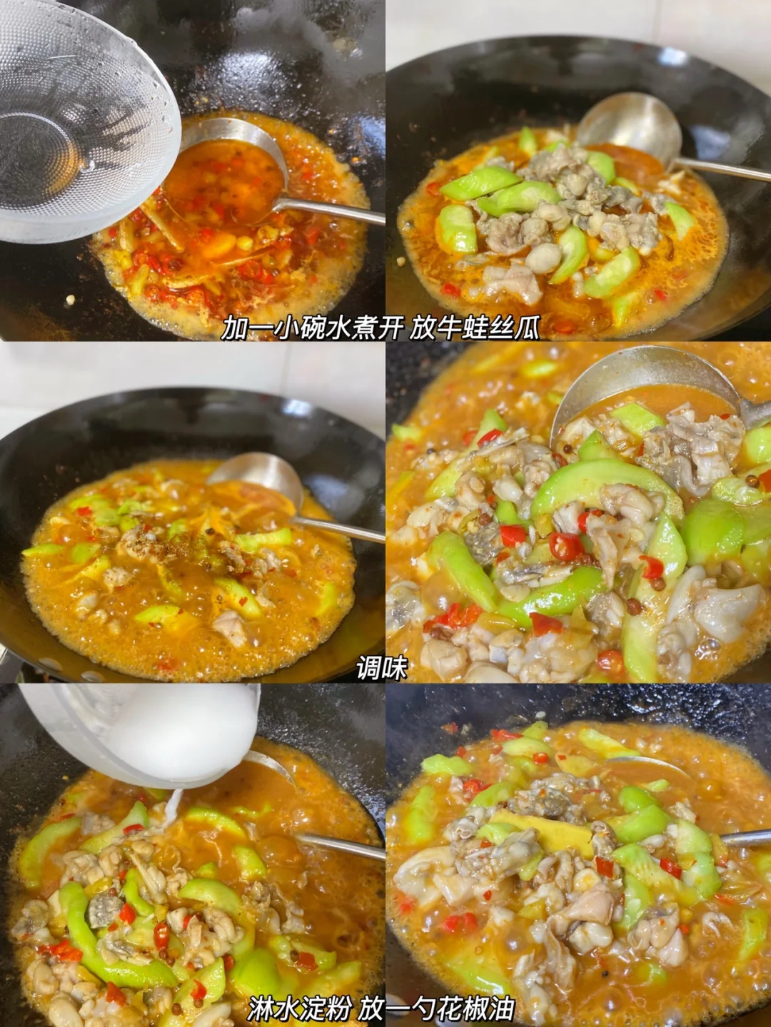 3⃣️:锅里多放油 烧热后倒入牛蛙炒微微变色后放入丝瓜再炒一分钟盛出。