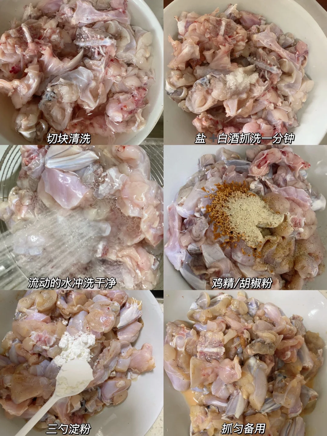 1⃣️:牛蛙切块 用清水洗一遍,然后➕一勺盐 一勺白酒抓洗一分钟。用流动的水冲洗干净(处理方法看图三)