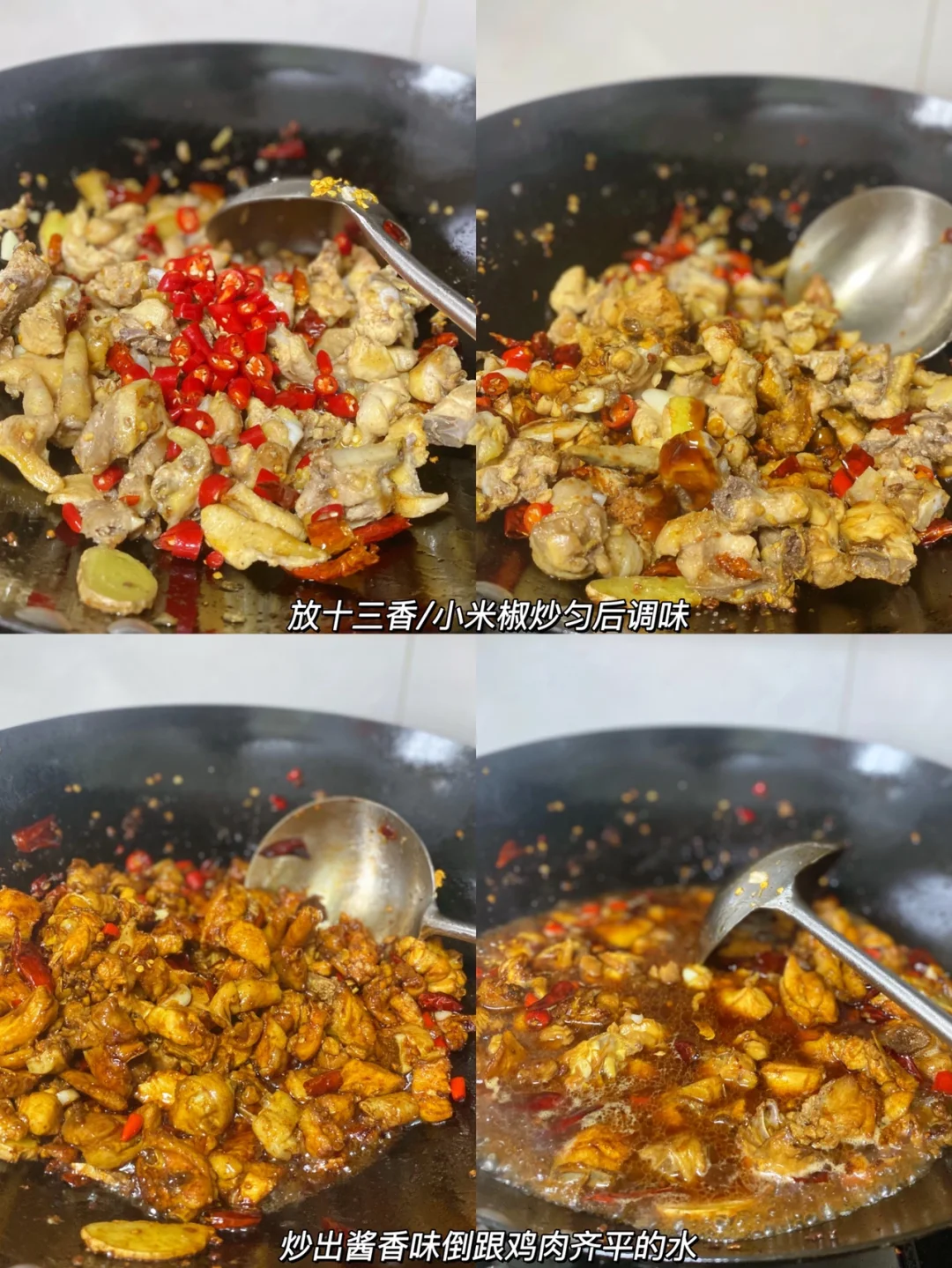 2⃣️:锅里倒油,放花椒 鸡肉炒两分钟左右,然后把鸡肉扒到一边 放姜蒜干辣椒炒香。再放一小勺十三香,把小米椒放进去一起炒
