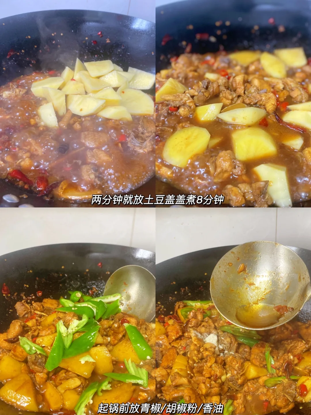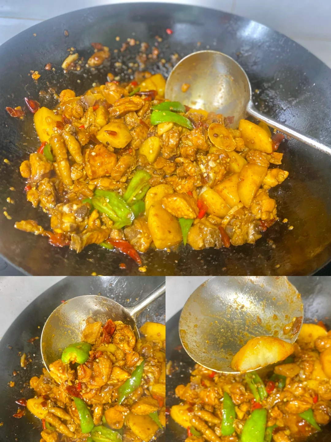 ✨食材:半只三黄鸡 (一斤半)土豆 姜片 蒜粒 干辣椒 小米椒 花椒 青椒