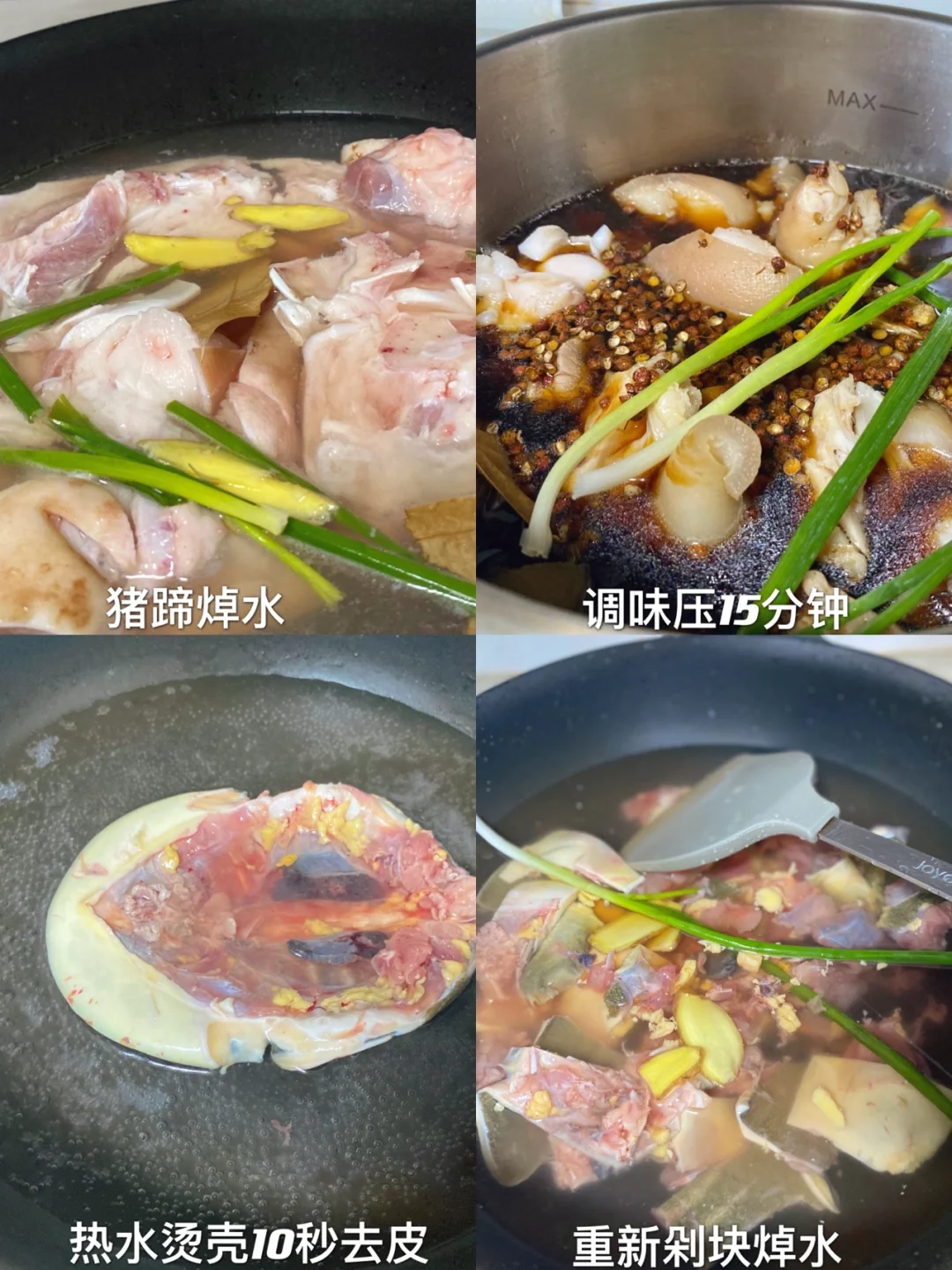 1⃣️:所有配料洗净切好。猪蹄冷水下锅加葱 姜 料酒 香叶焯水五分钟。捞出冷水冲洗一下,放入高压锅 加盖过猪蹄的水,加花椒 八角 桂皮 香叶 老抽两勺 生抽两勺🥄 胡椒粉少许,上汽后压15分钟。