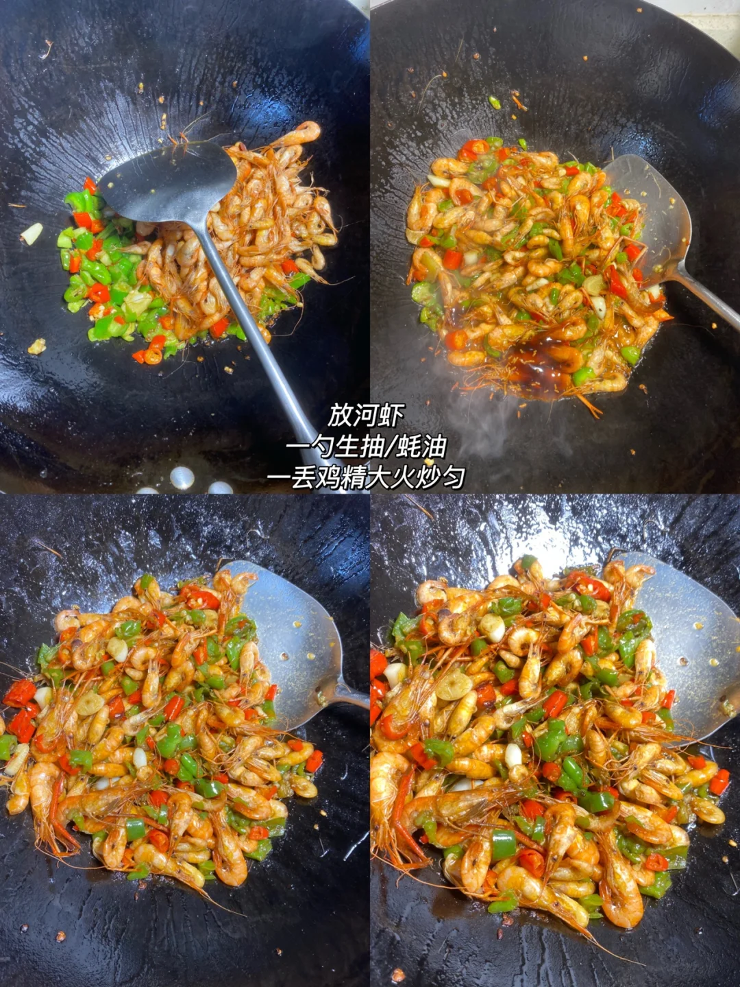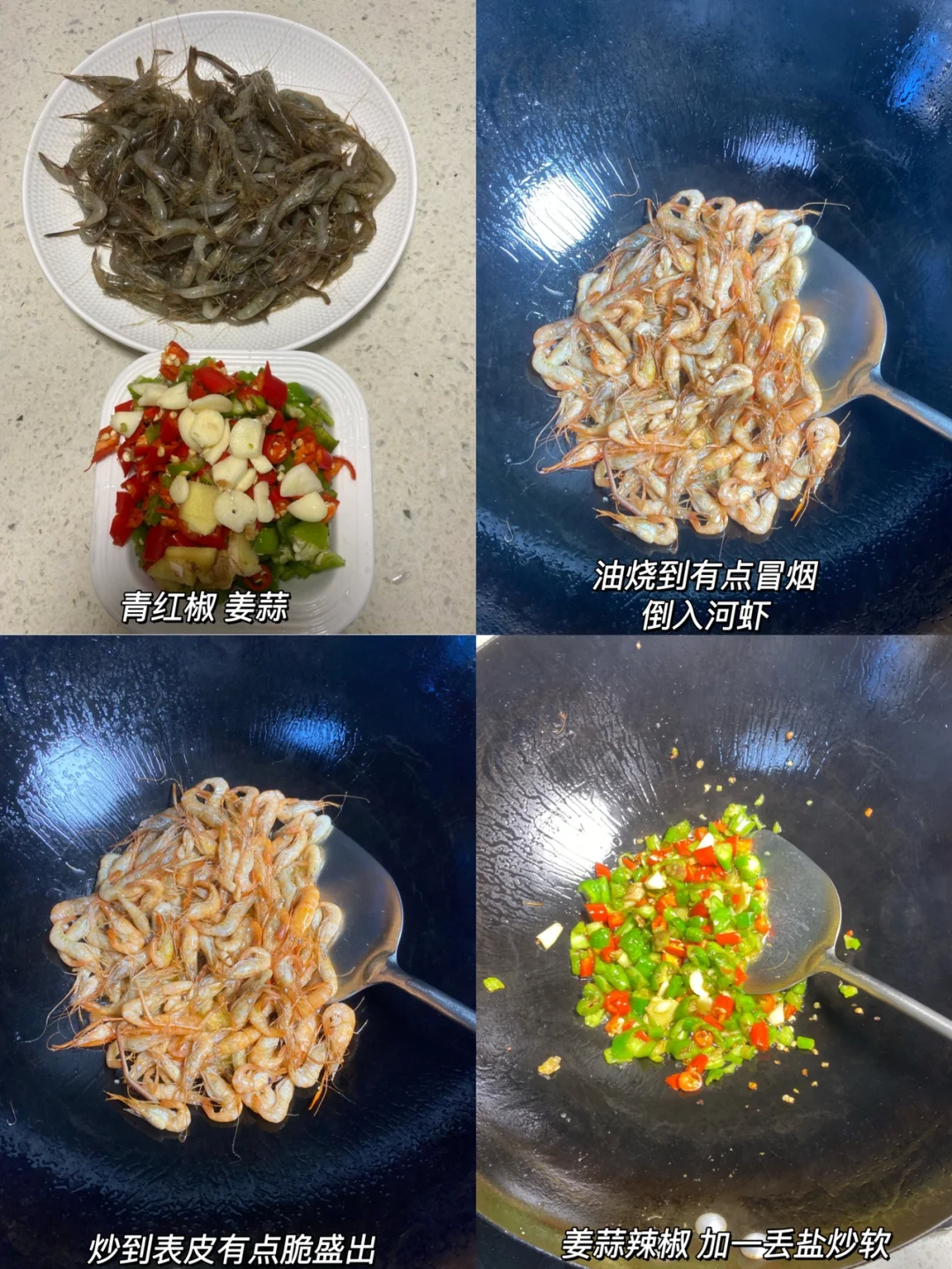 ✨食材:河虾 小米椒 青椒 姜 蒜 1⃣️:河虾冲洗干净控干水分。青红椒 姜蒜切好备用。 2⃣️:锅里倒油烧热 比平时炒菜多一倍的量。 油烧到有点冒烟 倒入河虾翻炒到表皮变脆盛出备用。 锅里留底油 放姜蒜辣椒加一点盐炒软,放入河虾,放一勺生抽/蚝油 一点鸡精 白糖大火炒匀炒入味。 青椒可以多放一点 好吃😋 除了吃多了有点扎嘴没毛病了哈哈哈哈 好好吃饭呀🤘🏻