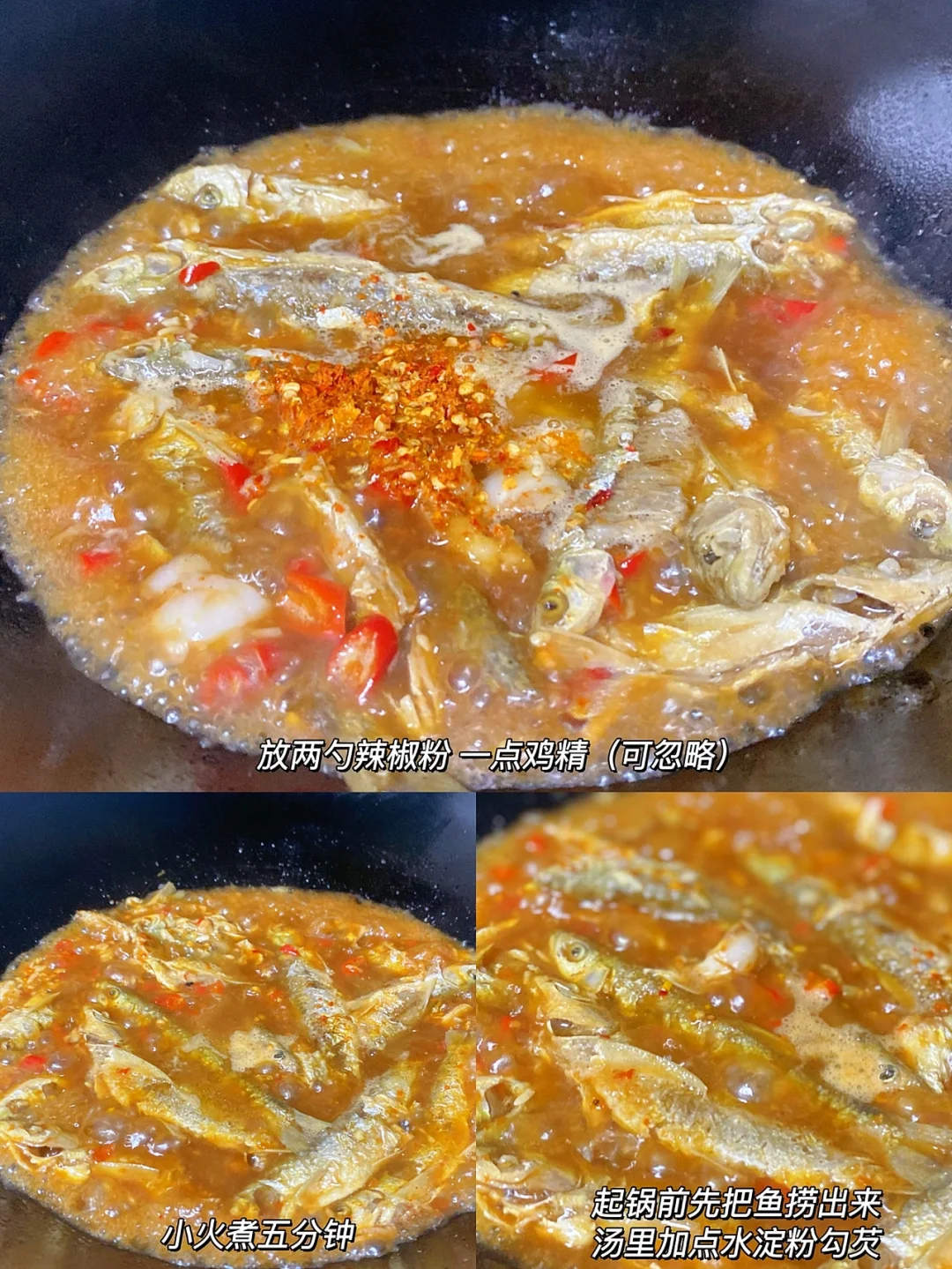 3⃣️:加一碗水,放一勺蚝油 半勺糖,大火煮开后倒入小鱼,放两勺米酒,两勺辣椒粉 一点鸡精。煮开后转小火煮五分钟。