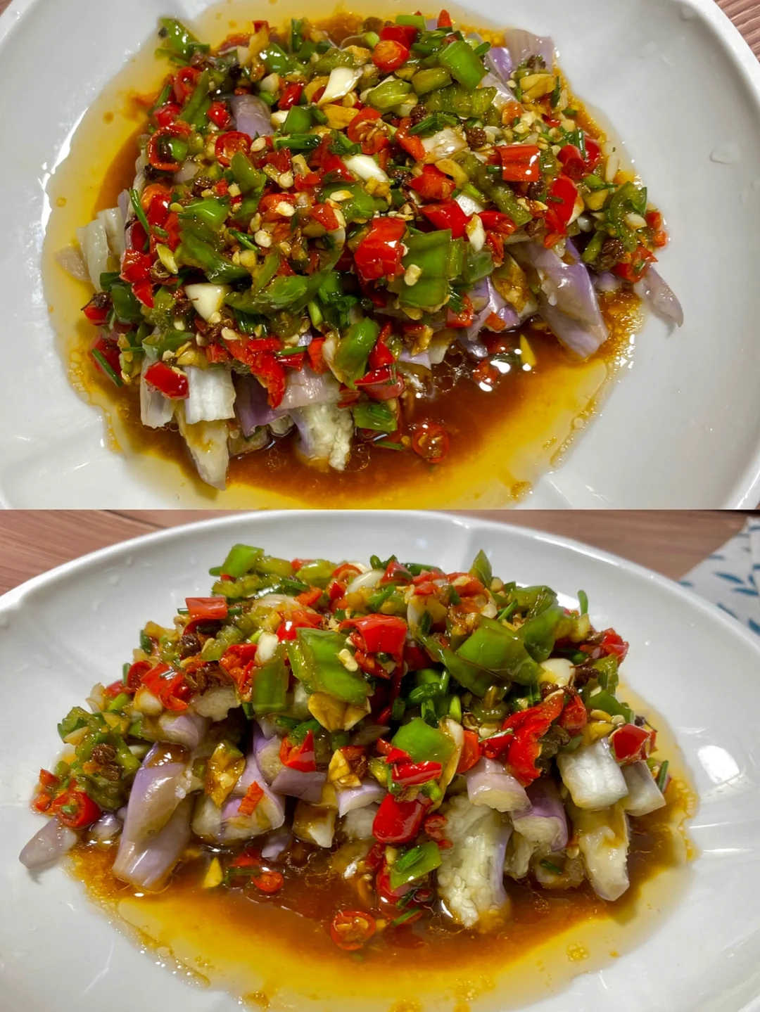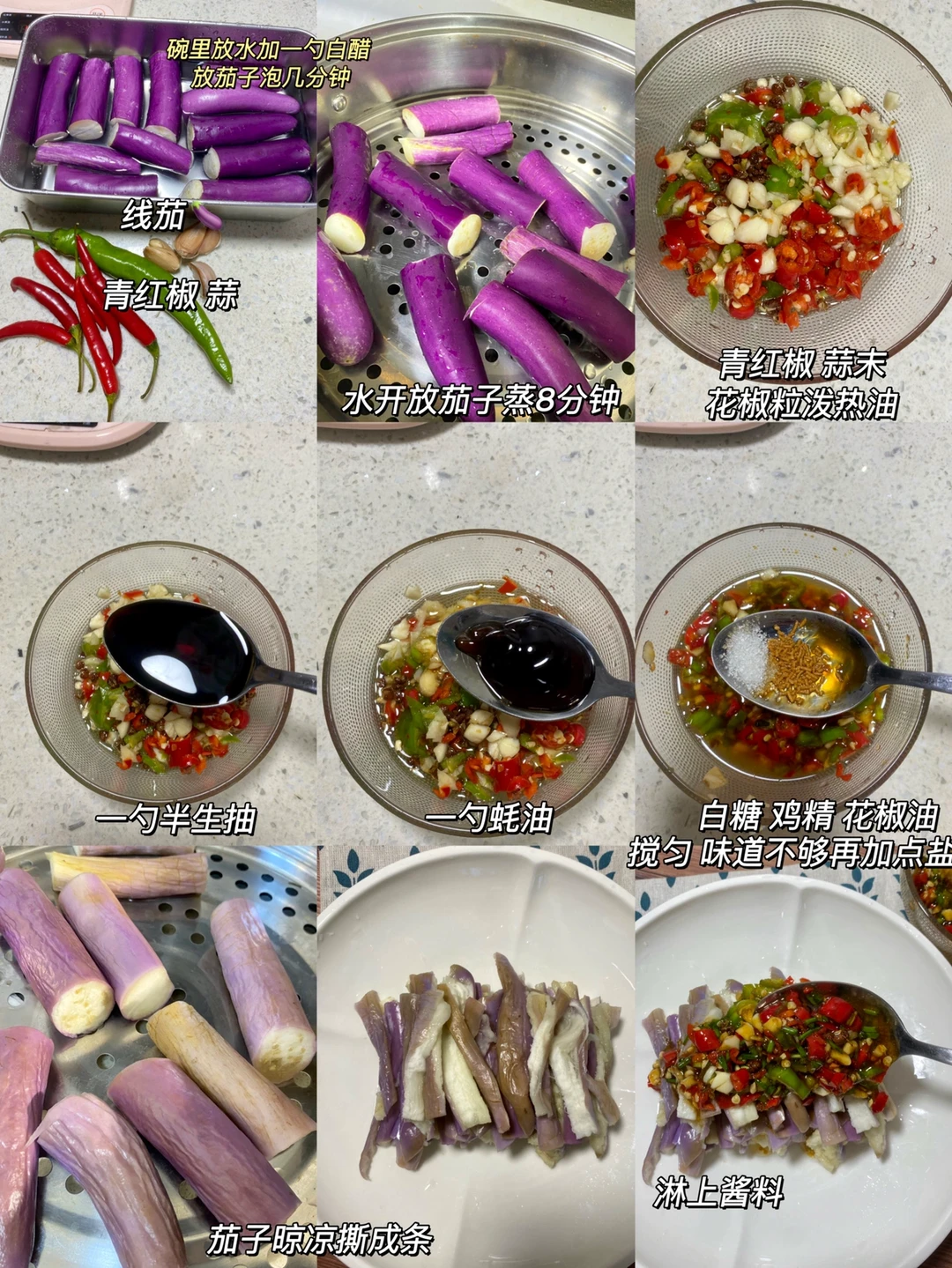 ✨食材:线茄🍆 小米椒 青椒 蒜 花椒粒 1⃣️:碗里放水加一小勺白醋,放茄子泡两分钟。锅里水烧开,放入茄子蒸八分钟(蒸熟就行) 青红椒 蒜切碎,放花椒粒,泼热油激发香味。放一勺半生抽,一勺蚝油,一点白糖 鸡精 花椒油搅拌均匀。 2⃣️:茄子蒸熟后晾凉撕成条,倒上酱汁,搅拌均匀。 其他茄子也可以哦 记得切小再蒸 好好吃饭呀🤘🏻